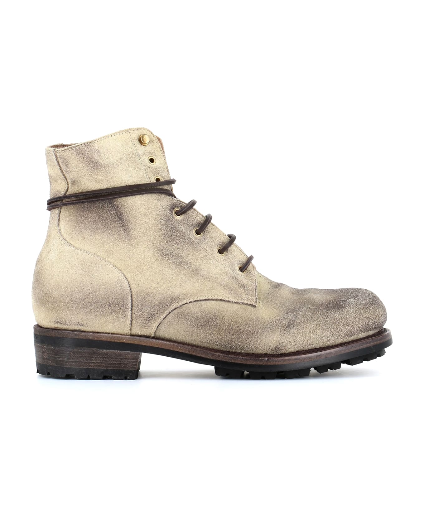 Light grey upside down horse leather with a vintage suede effect Lace-up Boot from Ajimone. Lined interior. Double leather fund and ''Vibram Tank'' rubber sole. 'Goodyear' Artisan manufacturing. Heel: 4 cm