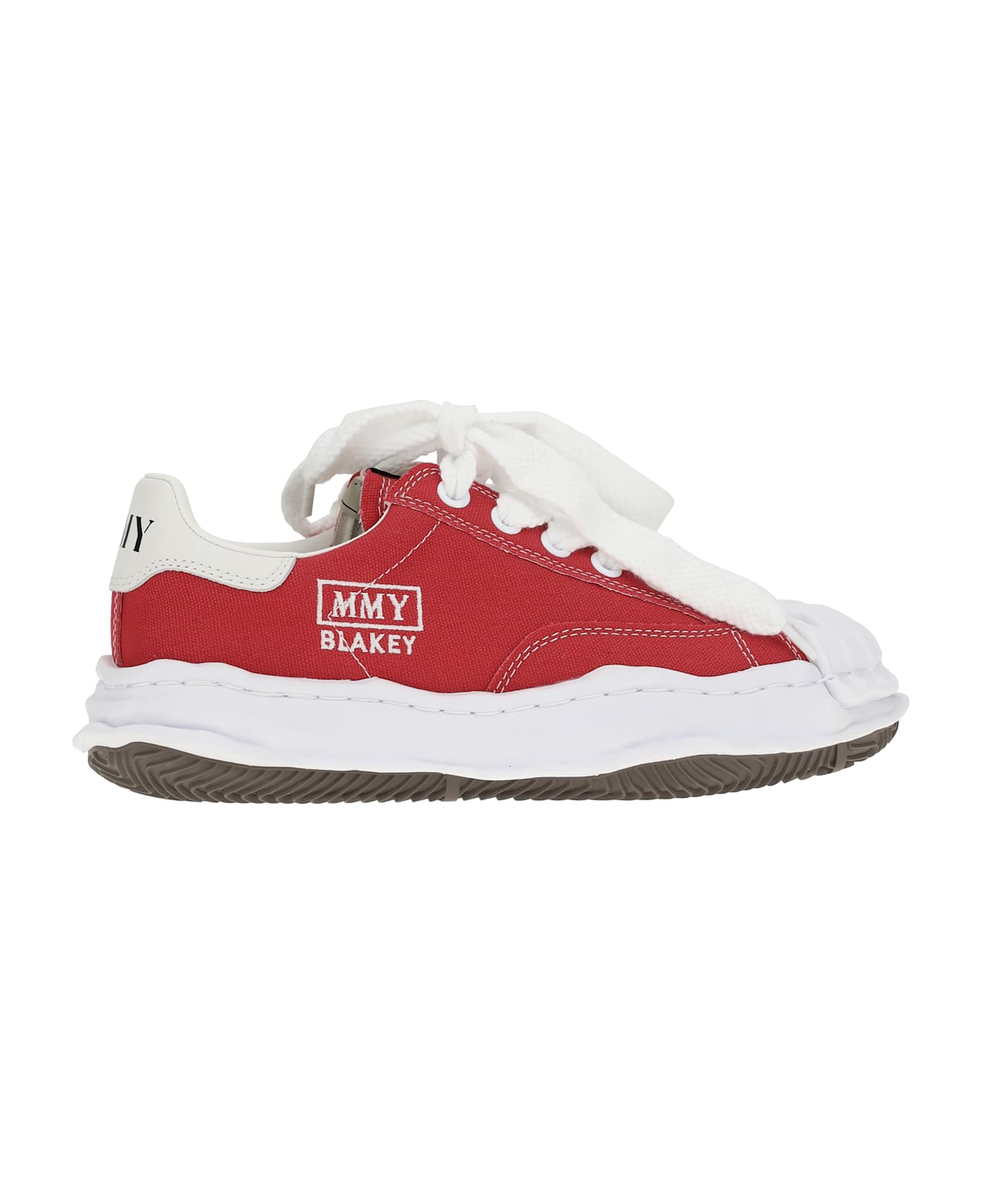 Maison mihara's blakey sneakers are a perfect blend of urban style and distinctive details. the black canvas upper, paired with white rubber, creates a stylish contrast. the lace-up closure and logo patch tongue add a touch of personality, while the side logo embroidery and white leather heel with logo print highlight the brand. contrast stitching and a rubber sole complete the design, making these sneakers a versatile and trendy accessory.