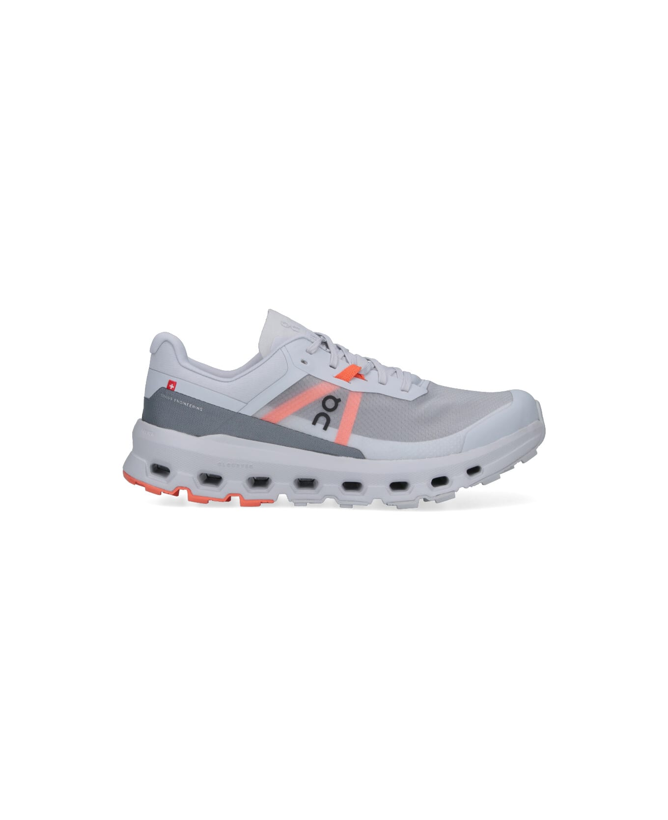 On Cloudvista 2 sneakers in gray fabric with round toe, top laces, logo label on tongue, logo print on the side, logo print on the back tab, red "Swiss Engineering" label on the back, and textured rubber sole.