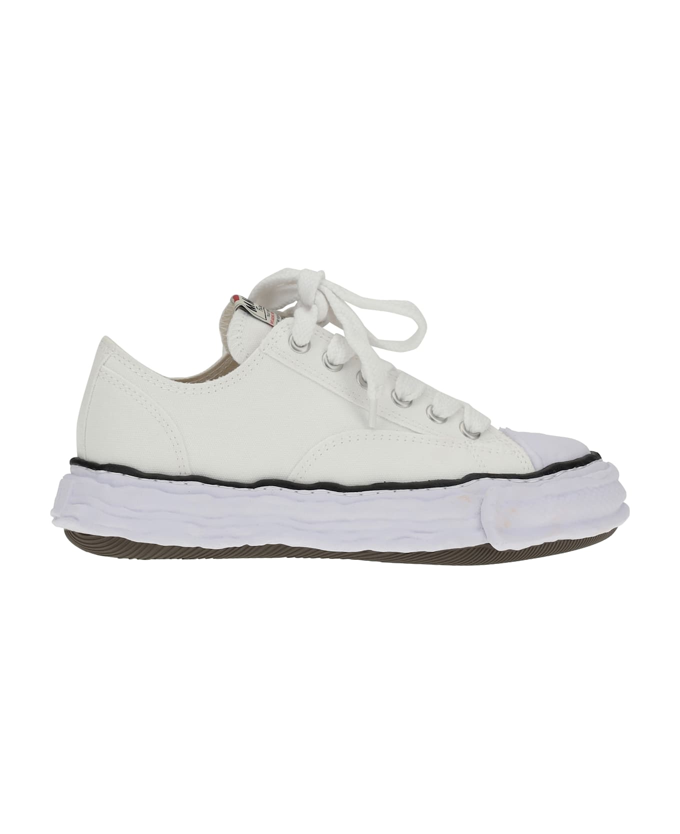 Maison mihara yasuhiro's peterson 23 sneakers feature a canvas upper embellished with contrast stitching that accentuates the minimalist design. the lace-up closure and logo patch tongue add a distinctive touch, while the white rubber sole completes the sleek and versatile aesthetic. a great choice for those seeking a casual yet sophisticated look.