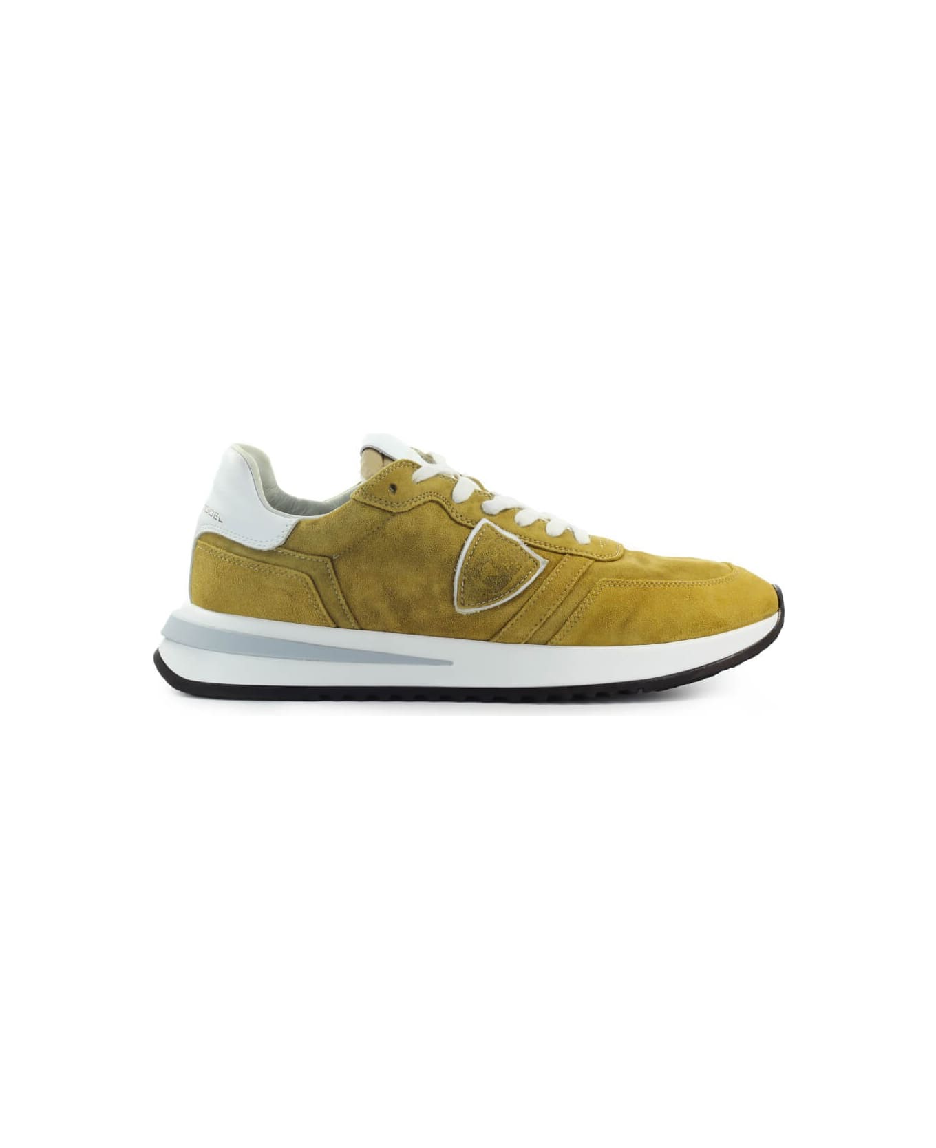 Tropez 2. 1 sneaker by Philippe Model made of mustard-colored suede with iconic side shield and rear detail in used-effect white leather. White cotton laces and rubber sole with contrasting insert, height 4 cm.