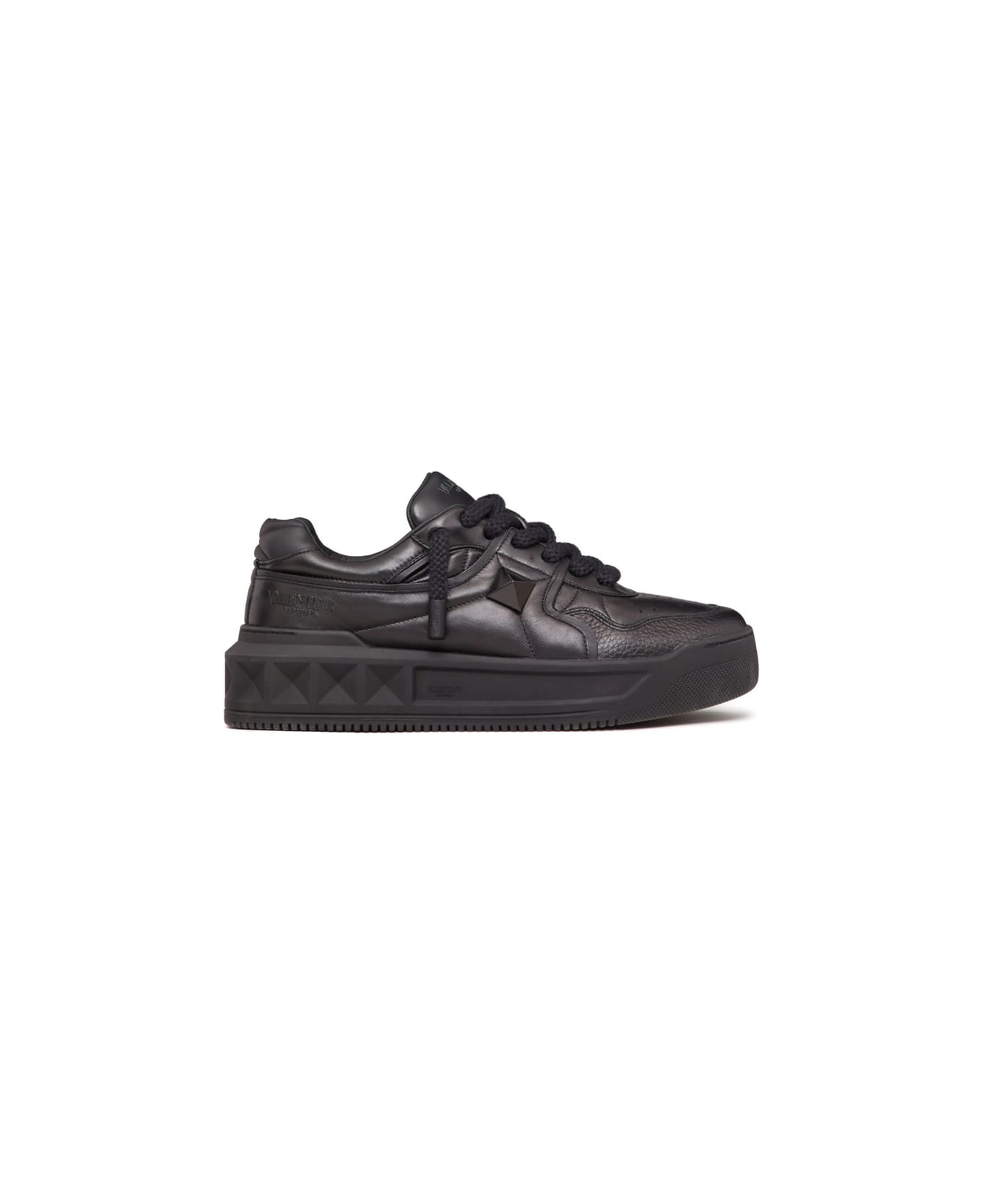 Valentino sneakers black nappa leather signature Roman Stud detailing logo-print tongue perforated toebox round toe front lace-up fastening flatform sole The full look includes Valentino Garavani accessories.