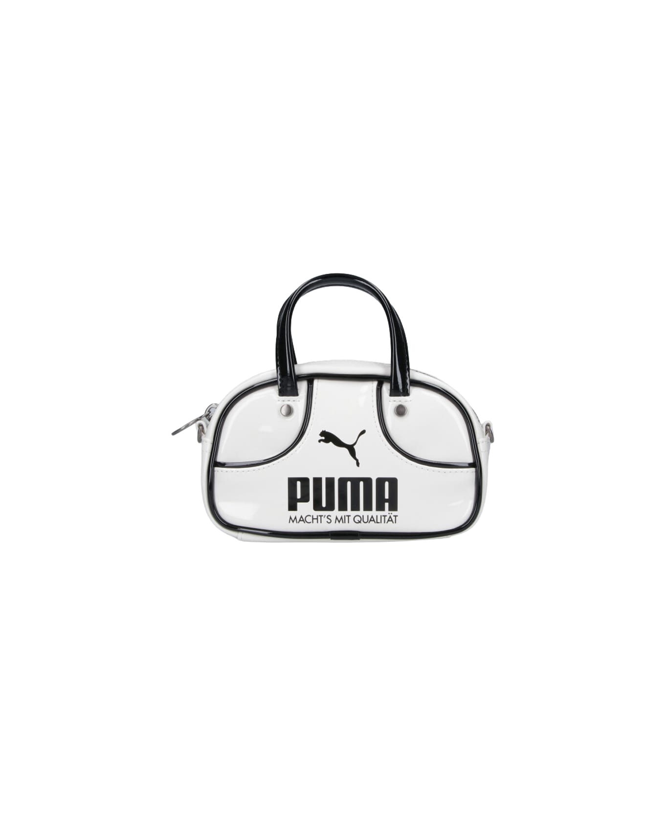 Puma '1976 micro grip' handbag in white patent fabric, two top handles, zip closure, removable shoulder strap, contrasting logo on the front, main inner compartment. Composition: 100% Polyester
