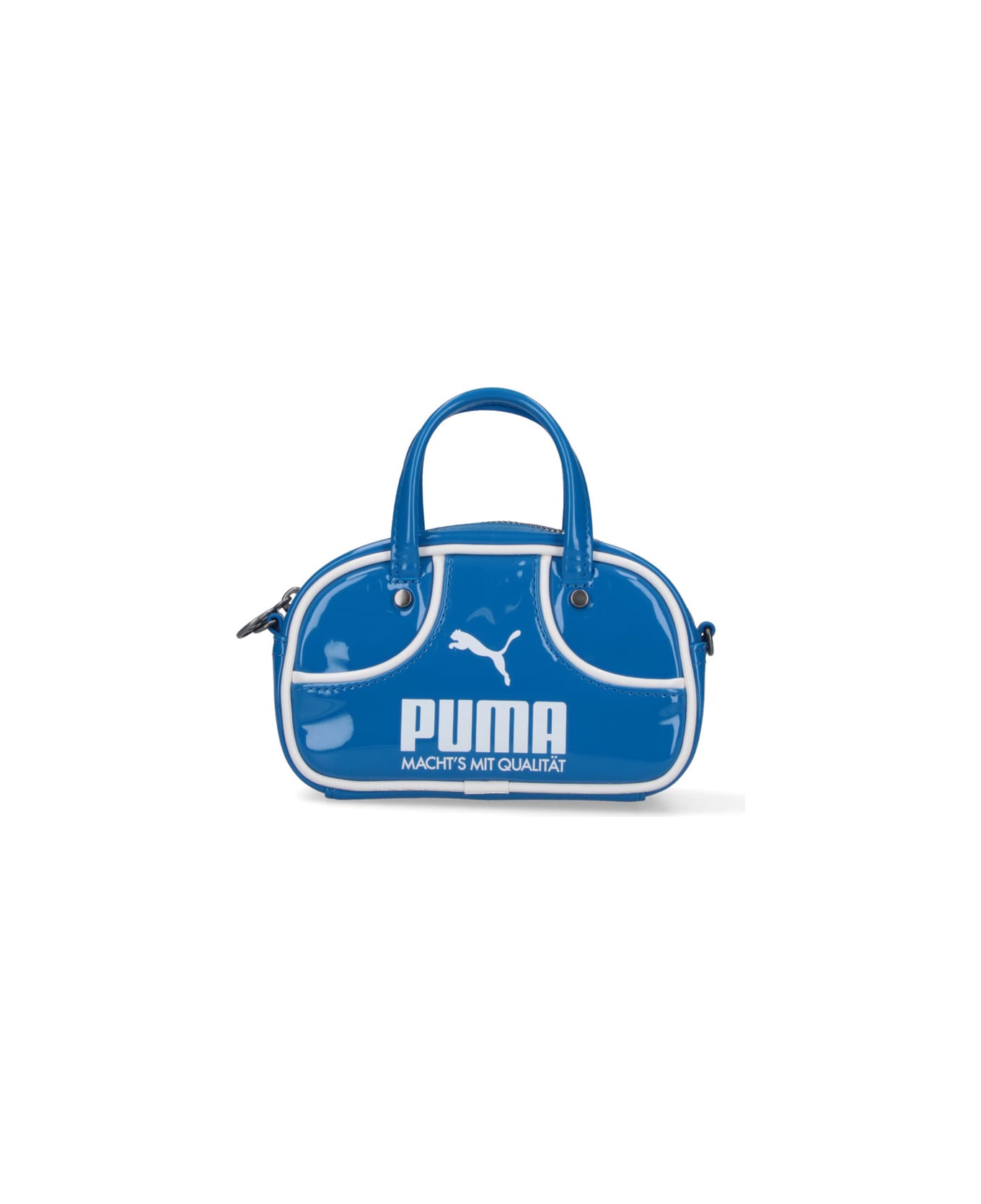 Puma '1976 micro grip' handbag in blue patent fabric, two top handles, zip closure, removable shoulder strap, contrasting logo on the front, main inner compartment. Composition: 100% Polyester
