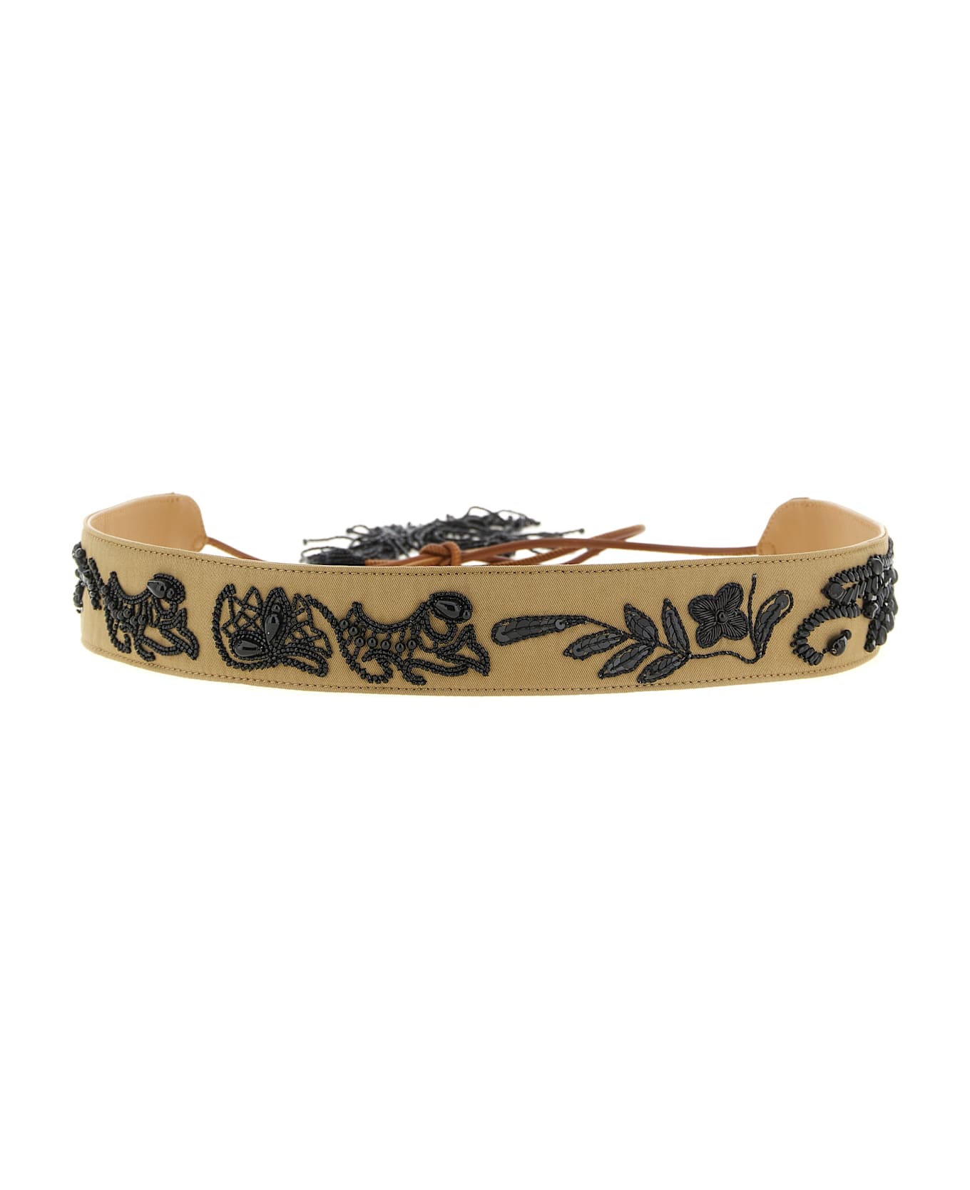 Leather belt with overlapping cotton canvas with embroidery of beads, to tie, tassels of beads.