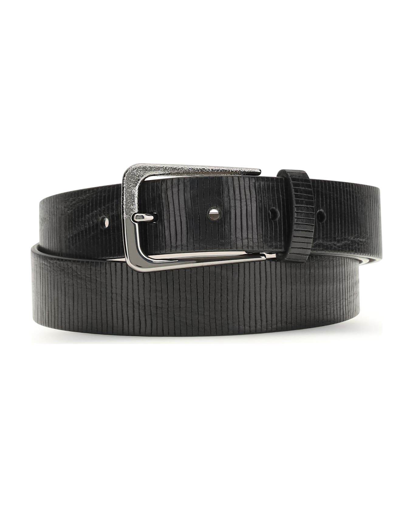 The carved leather belt with shimmering buckle by brunello cucinellistands out for its irregular and slightly shiny effect, which gives the leather an original and refined look. the hand-carved detailing enriches the design, while the buckle, crafted using a unique artisanal technique, amplifies the shiny effect of the metal, creating an elegant and refined contrast. an accessory that combines craftsmanship and style, ideal for adding an exclusive touch to any look.