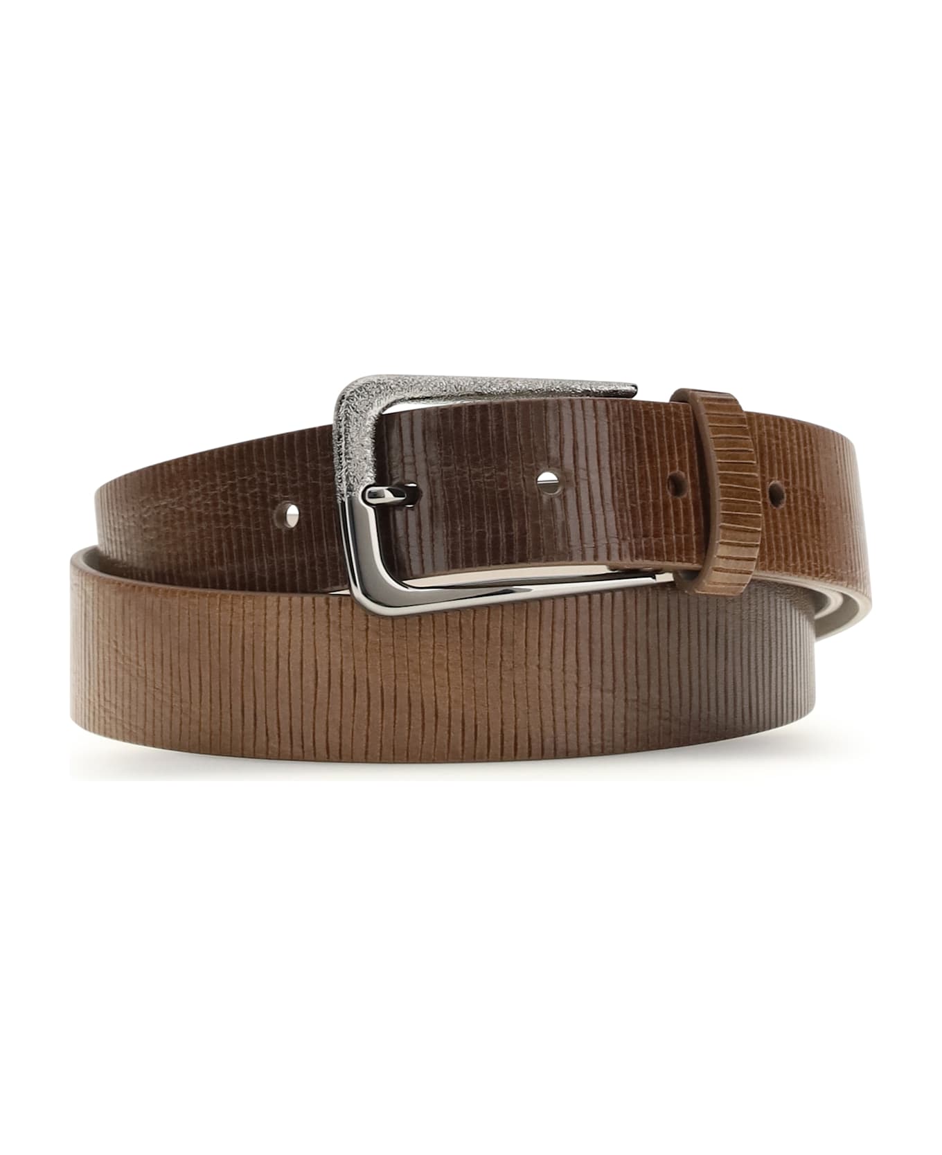 The carved leather belt with shimmering buckle by brunello cucinellistands out for its irregular and slightly shiny effect, which gives the leather an original and refined look. the hand-carved detailing enriches the design, while the buckle, crafted using a unique artisanal technique, amplifies the shiny effect of the metal, creating an elegant and refined contrast. an accessory that combines craftsmanship and style, ideal for adding an exclusive touch to any look.