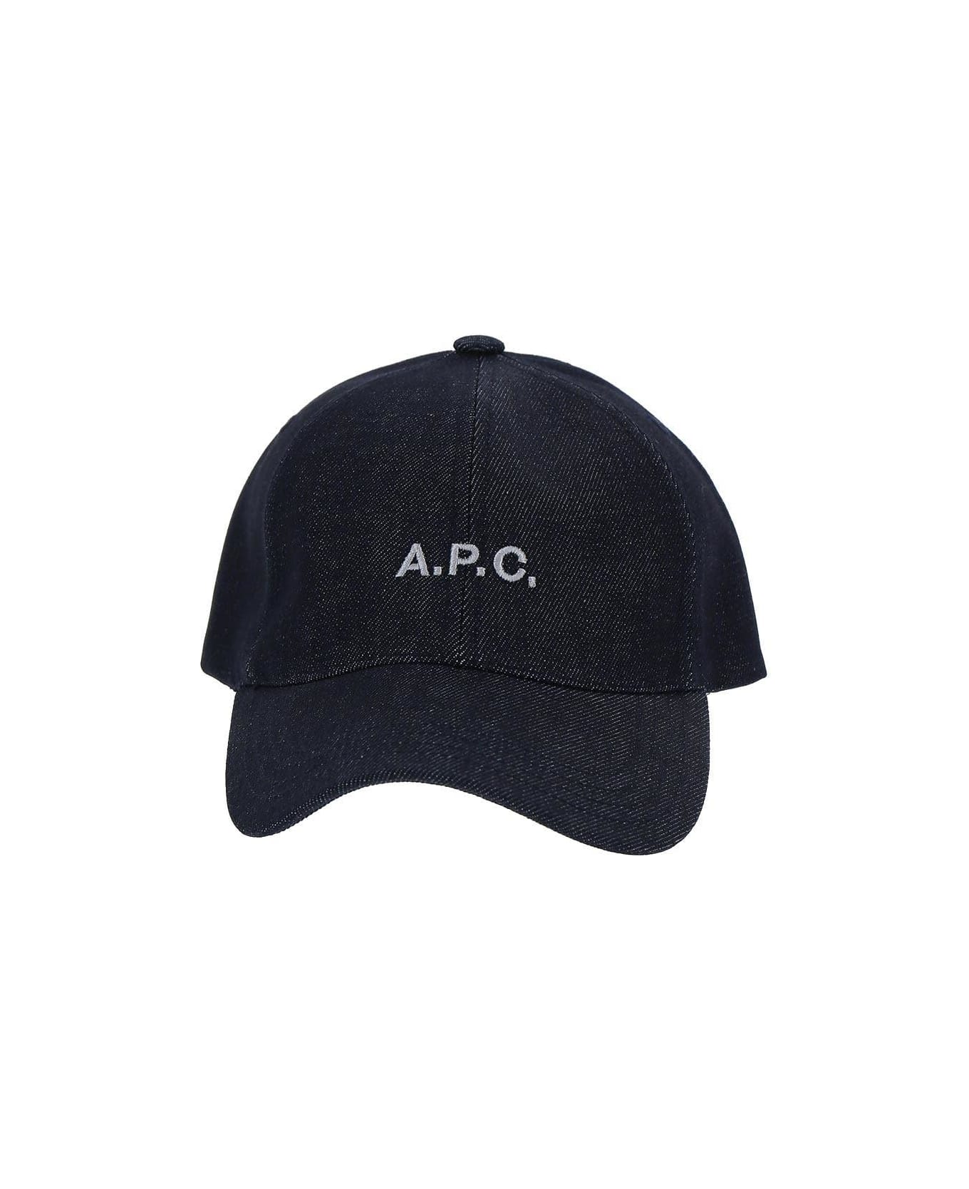 A. P. C. baseball cap in indigo Japanese denim with white logo embroidered on the front and adjustable back strap.