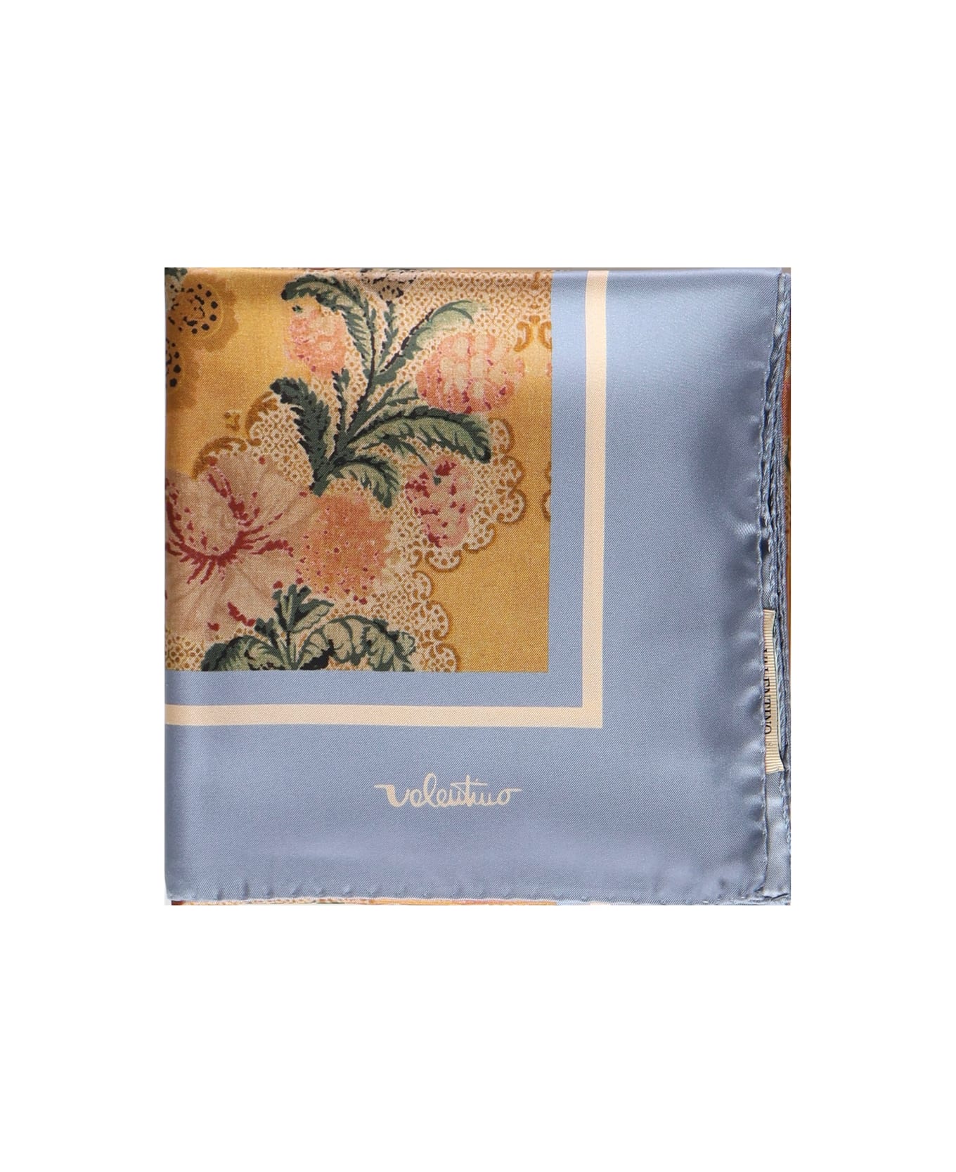 - Made of pure silk - Dimensions: 90 x 90 cm - Made in Italy - Designer Color: Multicolor, Butter, Light Blue