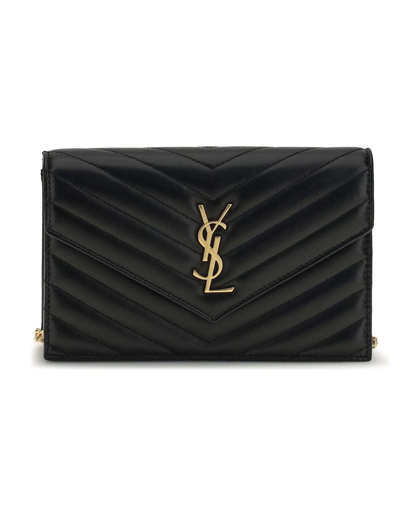 The envelope cassandre wallet by saint laurent combines elegance and functionality in a refined design. made of chevron-patterned leather, it is embellished with the iconic metallic monogram on the front. featuring a metal chain shoulder strap with leather shoulder pad, it offers versatility in style. the snap button closure provides security, while the interior is organized with a zipper pocket and a patch pocket, perfect for carrying essentials with class.