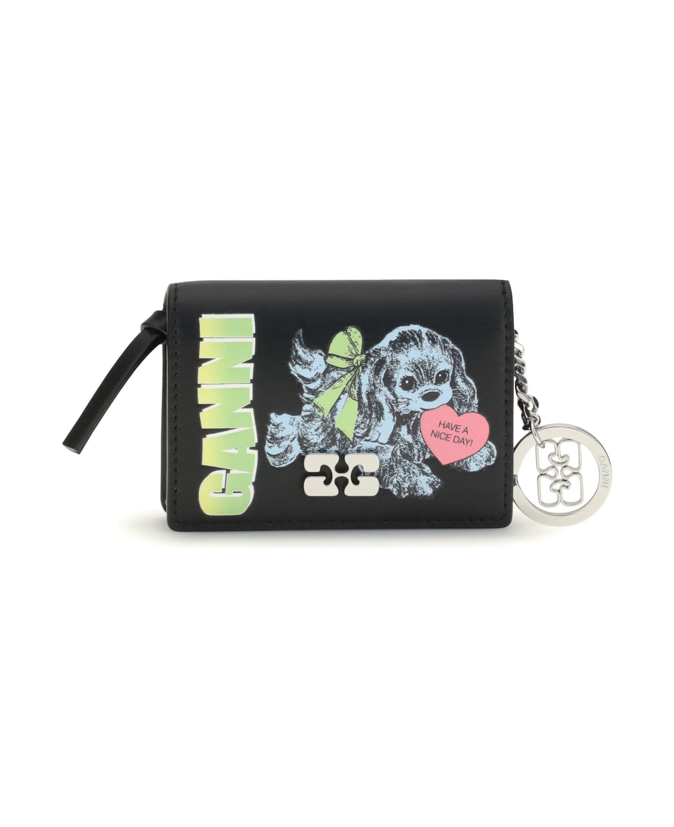 Puppy print card holder by ganni is a compact and original accessory decorated with a graphic print of a puppy that lends a playful touch to the design. it is embellished with the ganni butterfly hardware logo and a silver-colored key ring with engraved logo. featuring multiple compartments, it combines functionality and style in a practical, pocket-sized format. Composition: 65% % Recycled Leather, 19% % Polyurethane, 16% % Polyester