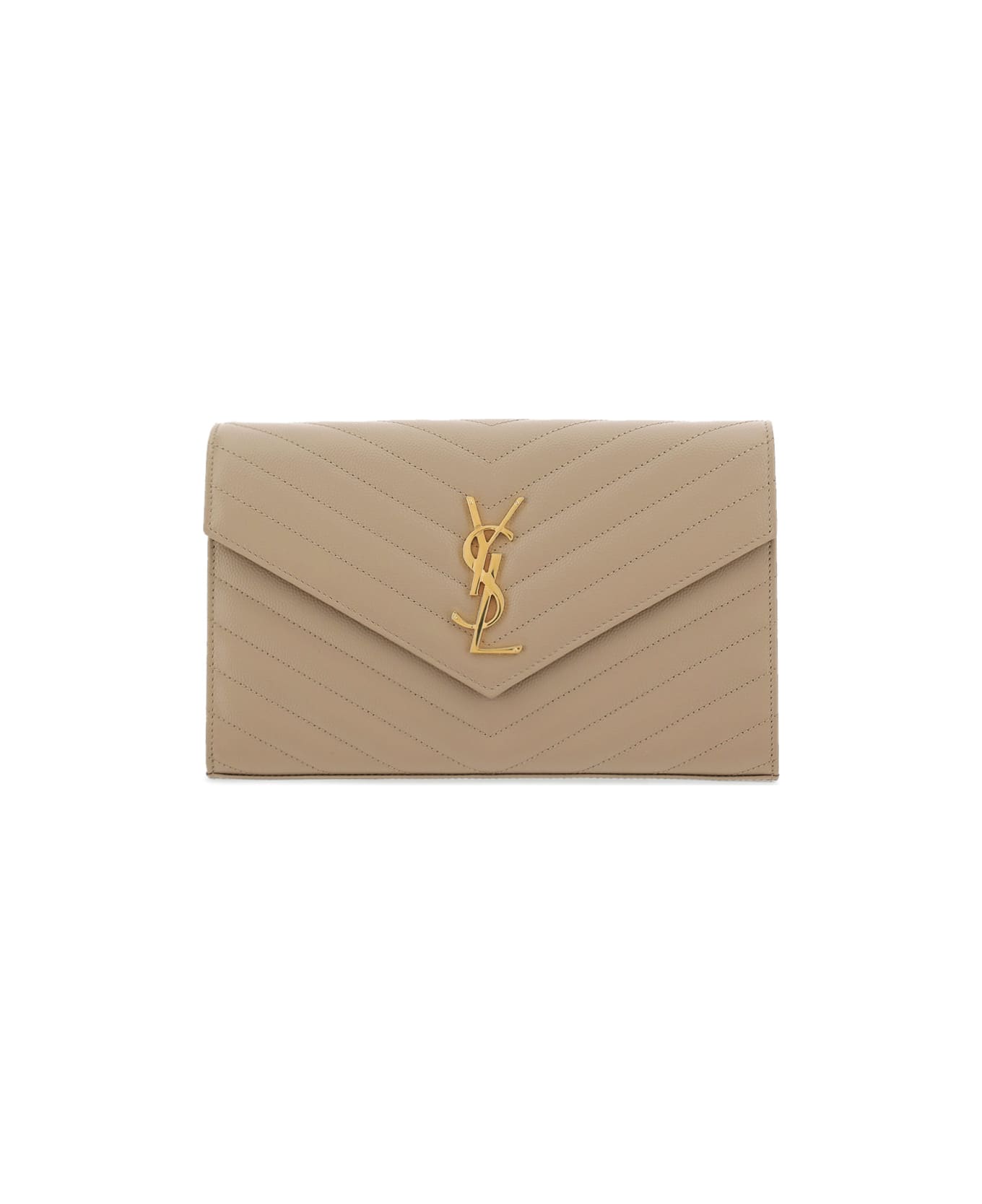 Leather monogram matellass蠣hain wallet by saint laurent, front closure with automatic button, slots card, four open pockets, one central zip pocket, embossed brand logo inside, golden brand logo on front, gold chain with leather handle.
