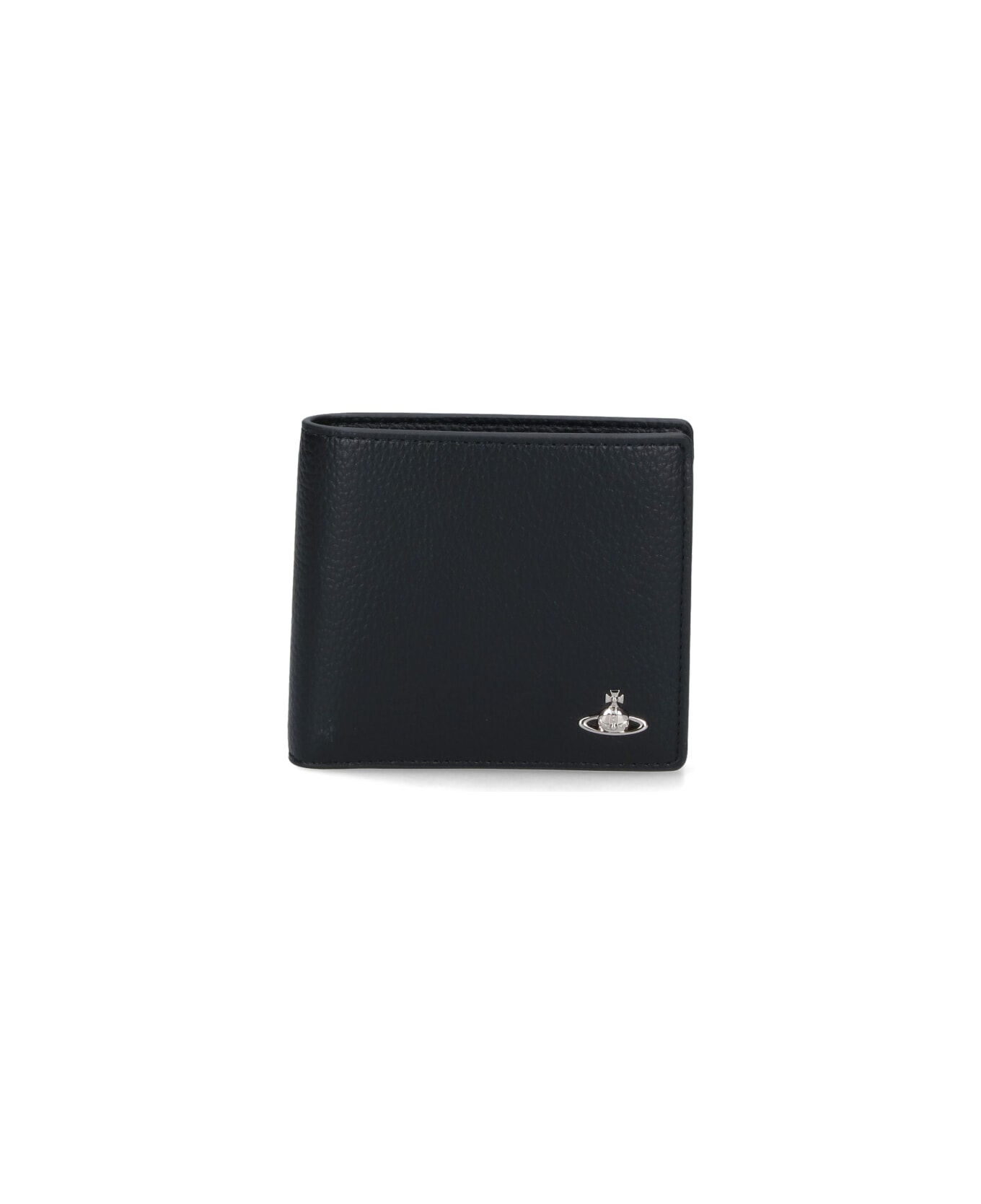 Vivienne Westwood 'orb' bi-fold wallet in black fabric, silver metal 'orb' logo on the front, three oblique card slots, an inner flap pocket, an inner bill compartment. Composition: 100% Polyurethane