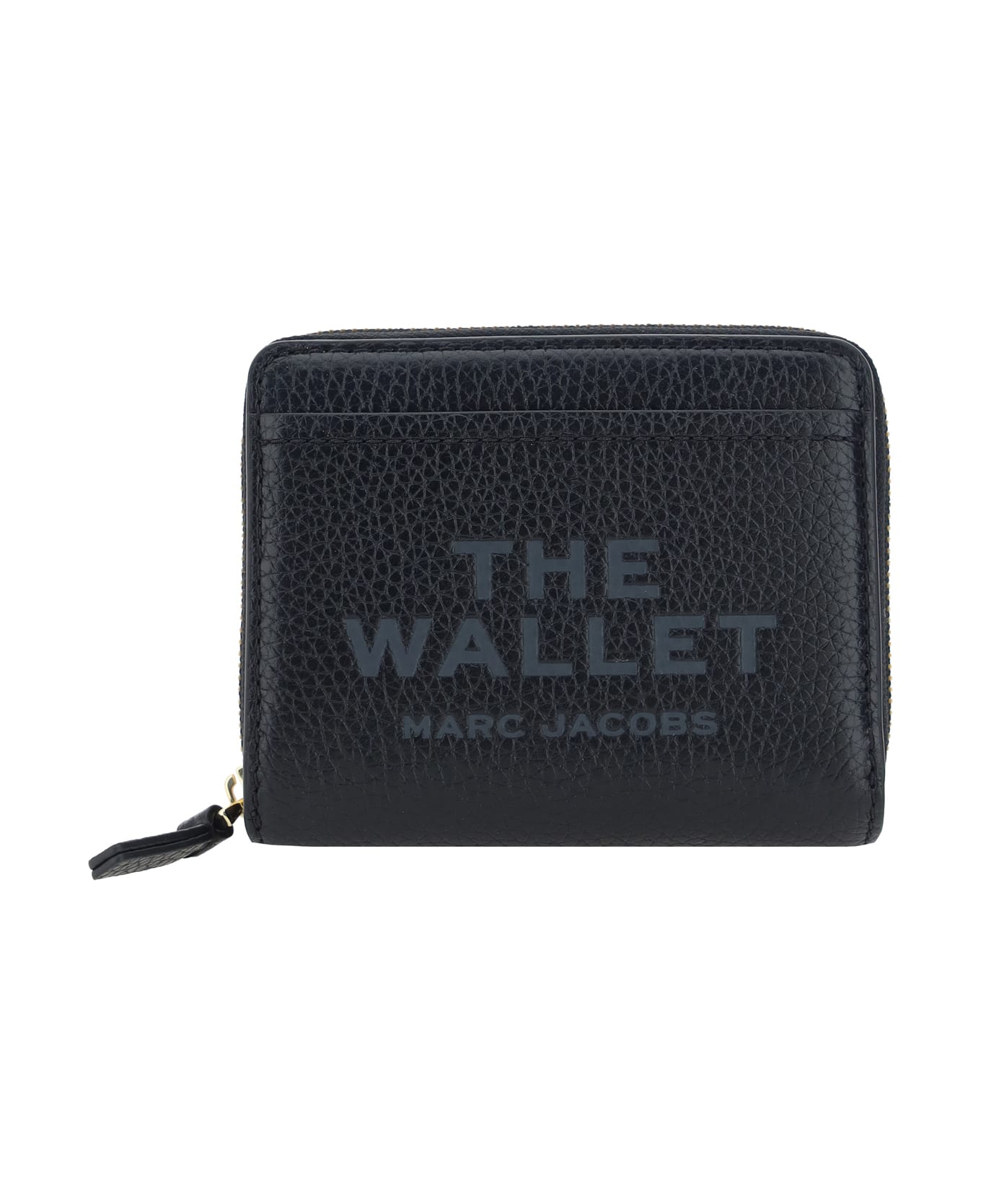 Calfskin wallet by marc jacobs, billfold model, grained leather design, snap-button closure, iconic brand monogram press-stamped on front, banknote compartment, dual interior card slots, coin compartment with zipper for closure.