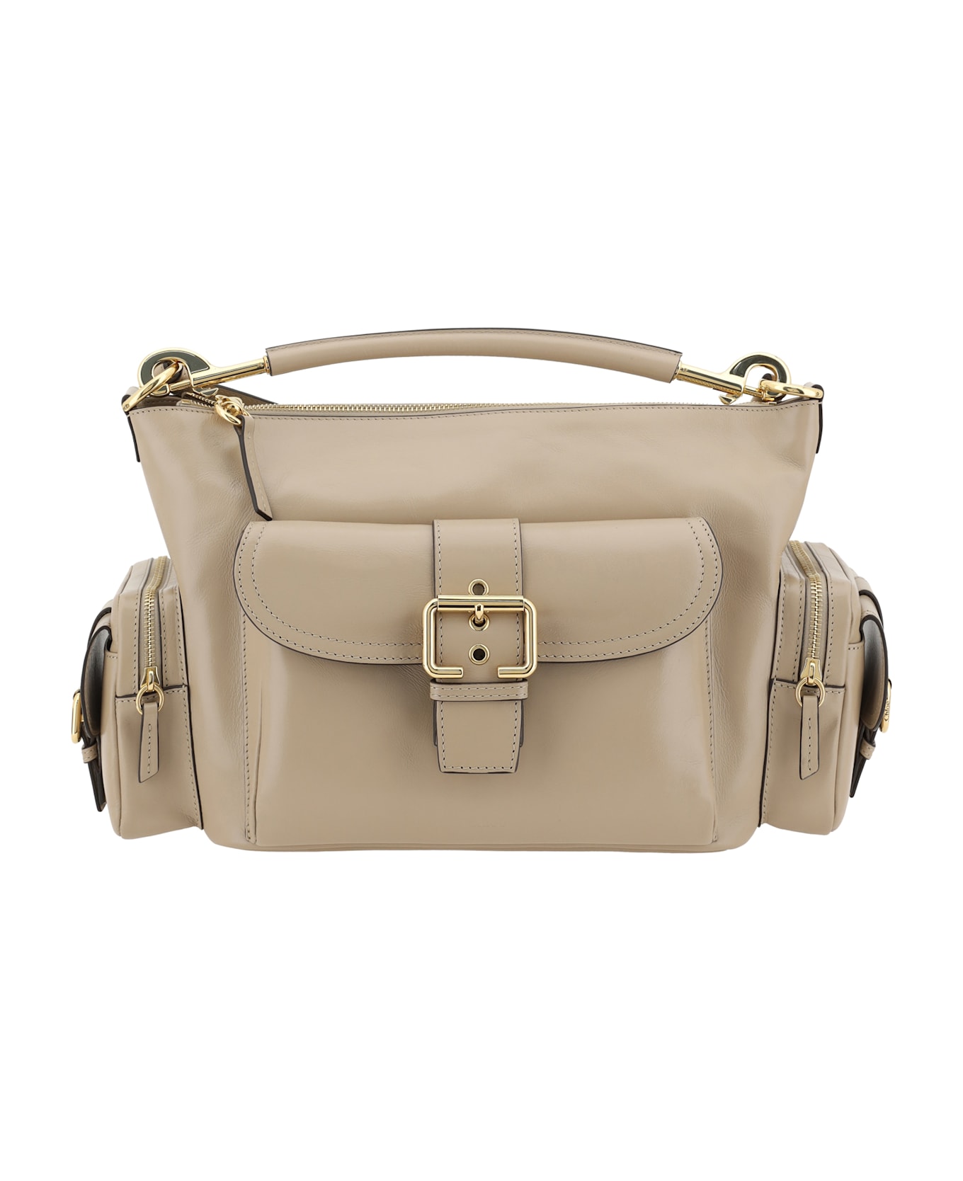 Chloé's camera handbag is a versatile and sophisticated accessory made of high-quality leather. it features a removable tubular handle on top for a stylish carrying option, along with an adjustable flat shoulder strap that can be removed to fit different needs. the zippered top closure provides security, while the two zippered side pockets offer convenience. an additional front pocket with flap and strap adds a distinctive touch. inside, a single compartment allows you to organize your belongings in style.