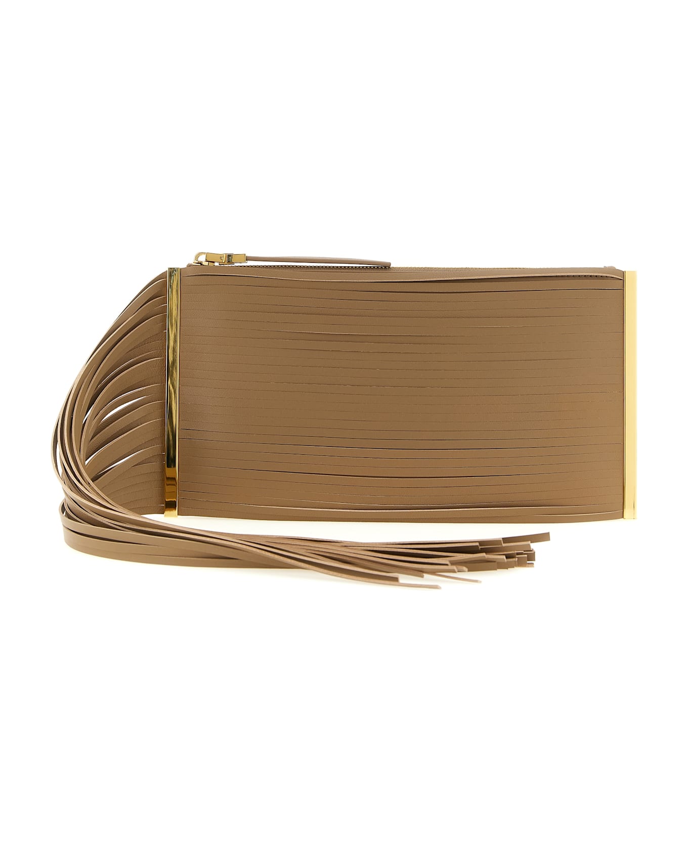 Leather clutch bag, fringes falling on the right side, side metal details, top zip closure, back embossed logo, removable chain shoulder strap.