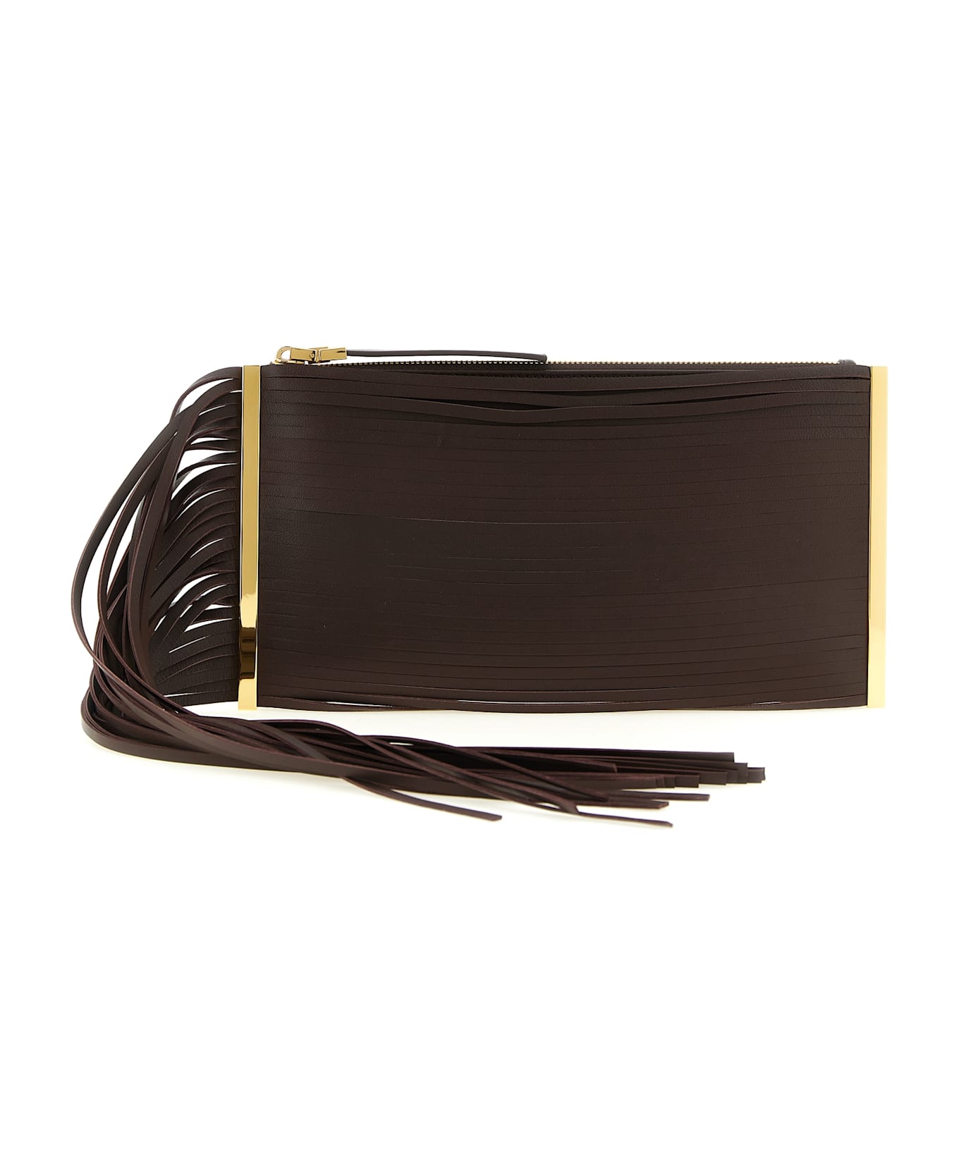 Leather clutch bag, fringes falling on the right side, side metal details, top zip closure, back embossed logo, removable chain shoulder strap.