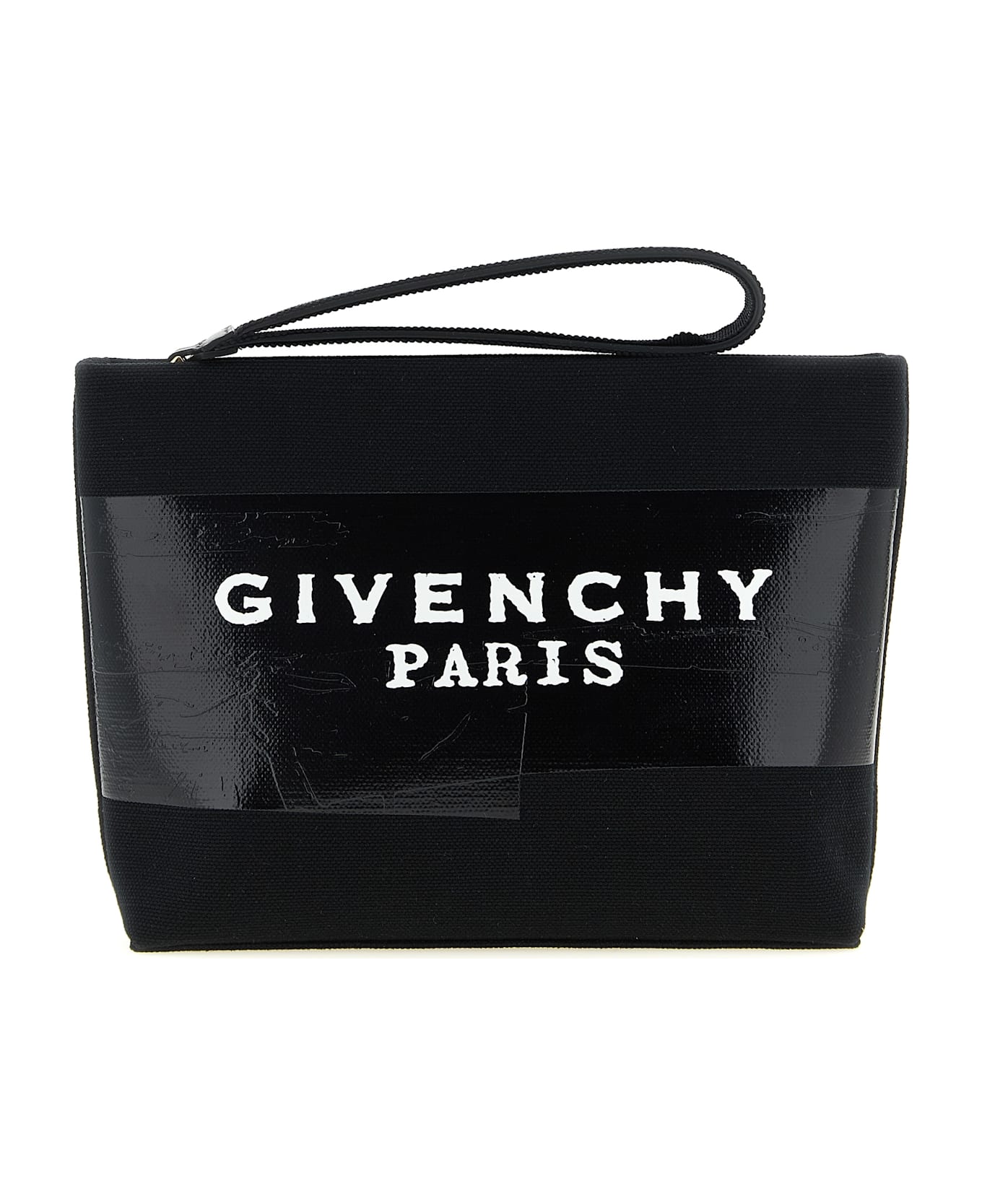 Small cotton canvas clutch bag with front 3D 'Givenchy Tape' print, top zip closure, leather handle covered in tone-on-tone grosgrain. Composition: 58% co, 38% li, 4% pu