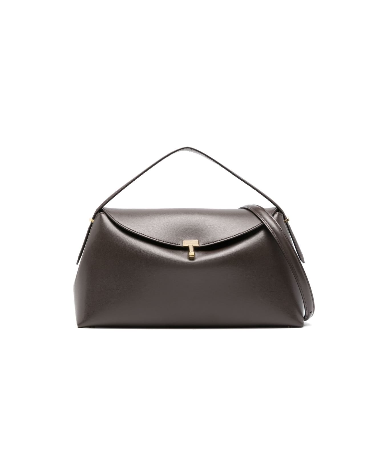 coffee brown calf leather smooth grain T-lock fastening single top handle adjustable detachable shoulder strap main compartment multiple internal slip pockets suede lining metal feet