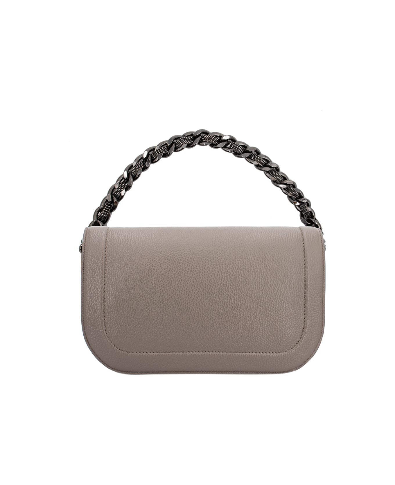 Calfskin leather bag, knurled texture, top flap with magnetic closure, two removable leather and shiny chain straps, divided inner compartment. Dimensions: 31 x 18 x 13 cm. Composition: 100% REAL, LEATHER