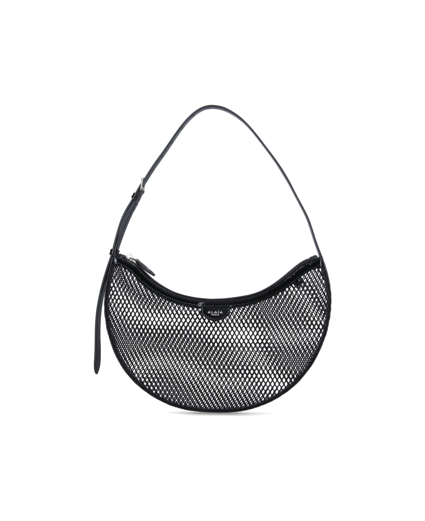 Demi Lune shoulder bag in mesh Alaïa, in black nylon, tone-on-tone leather details, adjustable shoulder strap with buckle, zip fastening, one main internal compartment, one removable internal leather zip pocket.