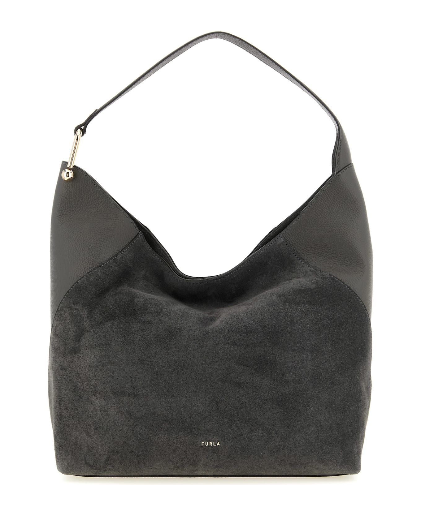 'Furla Lara' large shoulder bag in suede and smooth tone-on-tone calf leather, front metal lettering logo, magnetic closure, fixed handle with iconic Arco logo with metal ball element.