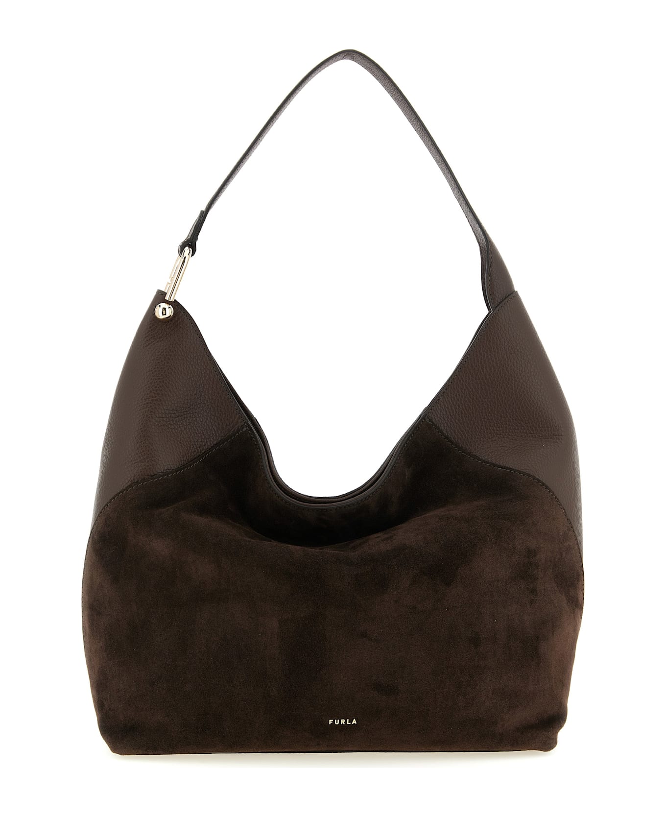 'Furla Lara' large shoulder bag in suede and smooth tone-on-tone calf leather, front metal lettering logo, magnetic closure, fixed handle with iconic Arco logo with metal ball element.