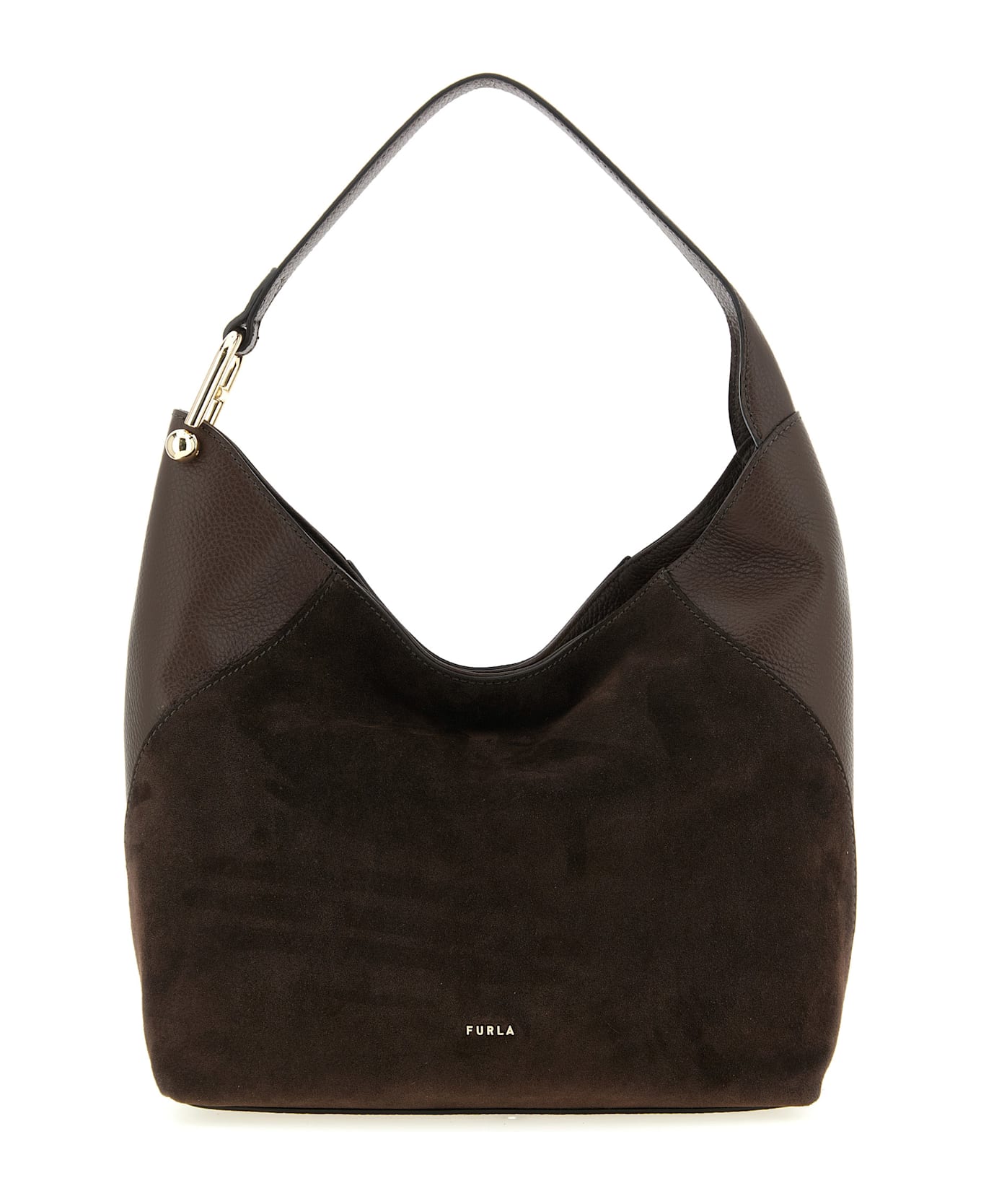 'Furla Lara' medium shoulder bag in suede and smooth tone-on-tone calf leather, front metal lettering logo, magnetic closure, fixed handle with iconic Arco logo with metal ball element.