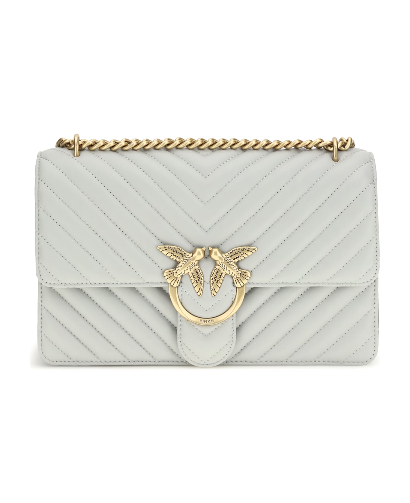 The love one classic leather shoulder bag by pinko is a true symbol of elegance and versatility. the front magnetic button closure ensures ease of use and security, while the iconic gold-plated love birds logo, embossed on the front, is a distinctive mark of luxury. the quilted and padded design gives a sophisticated texture, making the bag not only beautiful, but also pleasant to the touch. with the double internal compartment, this bag offers functionality, allowing you to organize objects in a practical and orderly way. the sliding chain shoulder strap allows you to wear it comfortably, while the flat leather shoulder strap, adjustable and removable, offers the possibility of personalising the look according to your preferences. the tone-on-tone embroidered brand monogram on the back adds an additional exclusive detail.