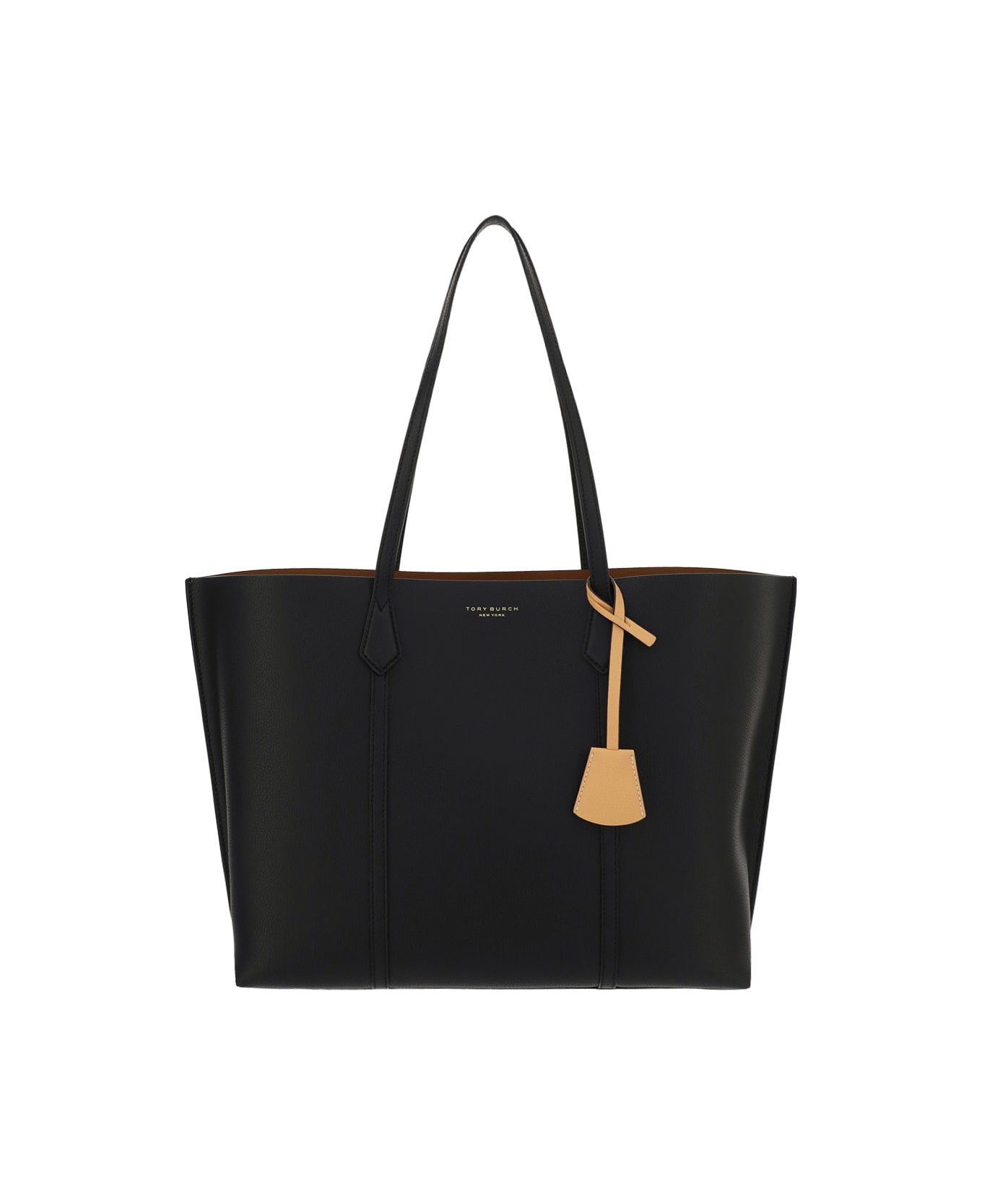 Perry Triple Leather Shoulder Bag by Tory Burch, featuring two slim handles, printed logo on front, removable nameplate on front, two interior compartments with center zipper pocket.