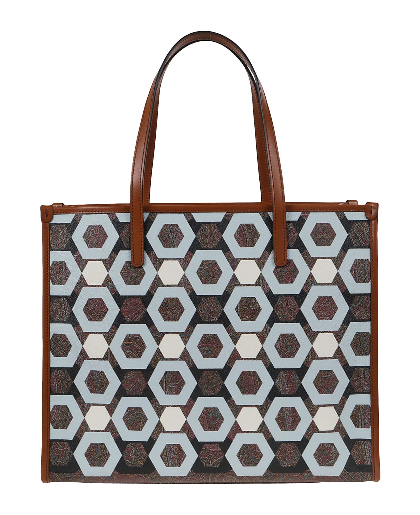 Shopping bag in Paisley jacquard fabric BY ETRO. Contrasting leather handles and profiles. All over geometric patch print detail.
