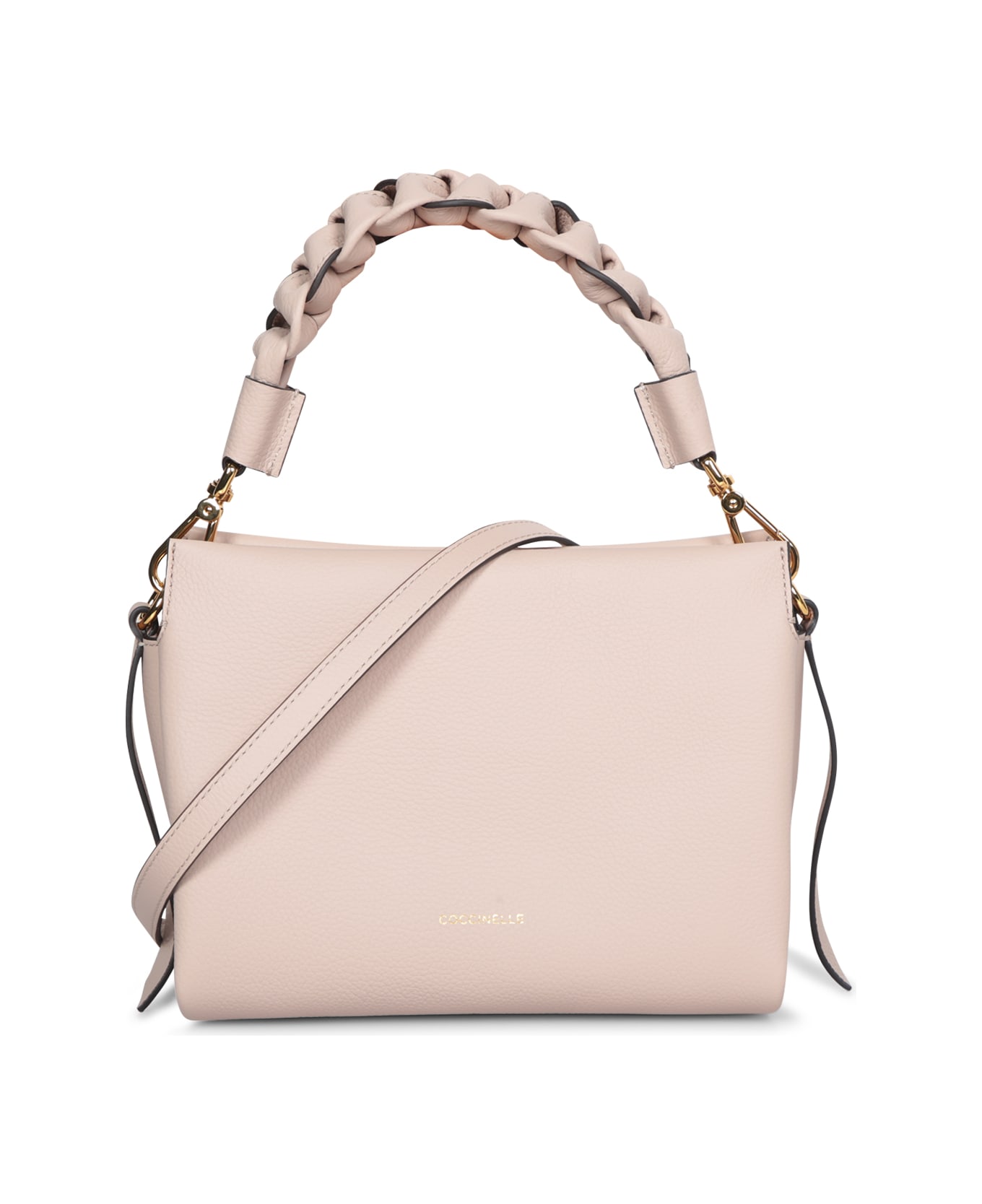 This elegant Coccinelle rosette-colored leather bag features braided handles and a removable strap, making it easy to transform from a handbag to a shoulder bag with a simple gesture.