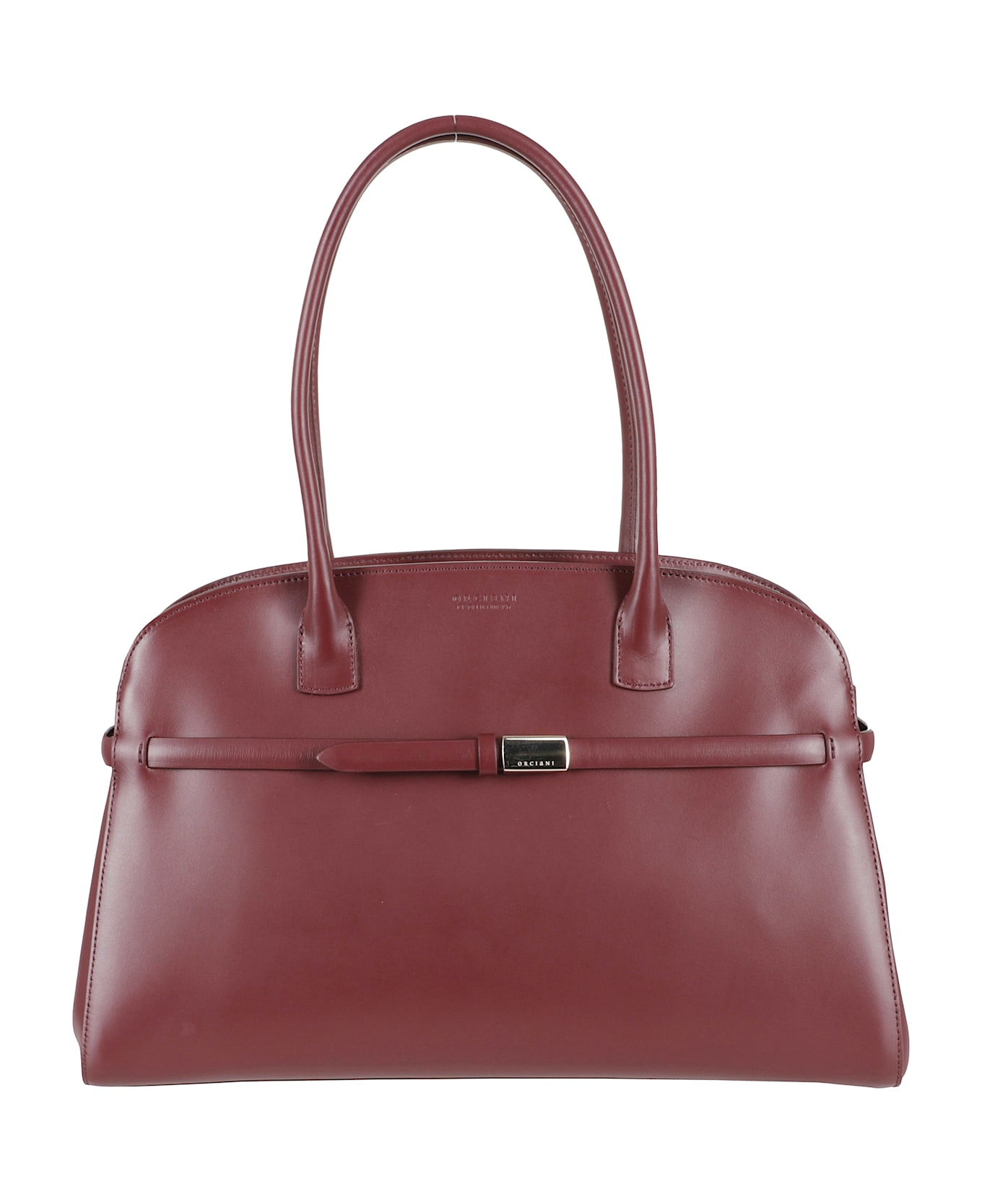 Aura bag -Orciani -Burgundy color -Double handles -One internal compartment -Front logo -Buckle -Magnetic button closure -Adjustable and removable shoulder strap -Dimensions: Width 41cm x Height 26cm x Depth 14cm