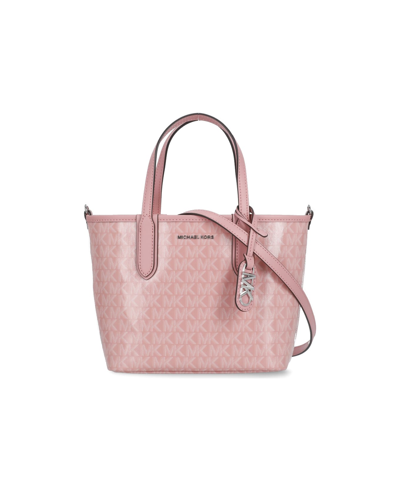 Eliza Hand Bag from MICHAEL Michael Kors: - Pink Michael Kors cotton and PVC hand bag for woman - Front golden relief Michael Kors logo - Charm with Michael Kors golden relief monogram - All-over monogram print - Matching included pochette