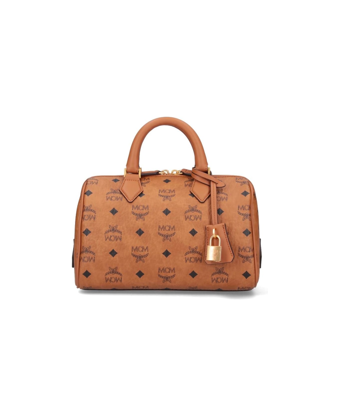 MCM 'Ella Boston' trunk bag in brown visetos with rigid handles, adjustable and removable shoulder strap, zip closure, removable padlock detail on the front, inner pocket, inner compartment.