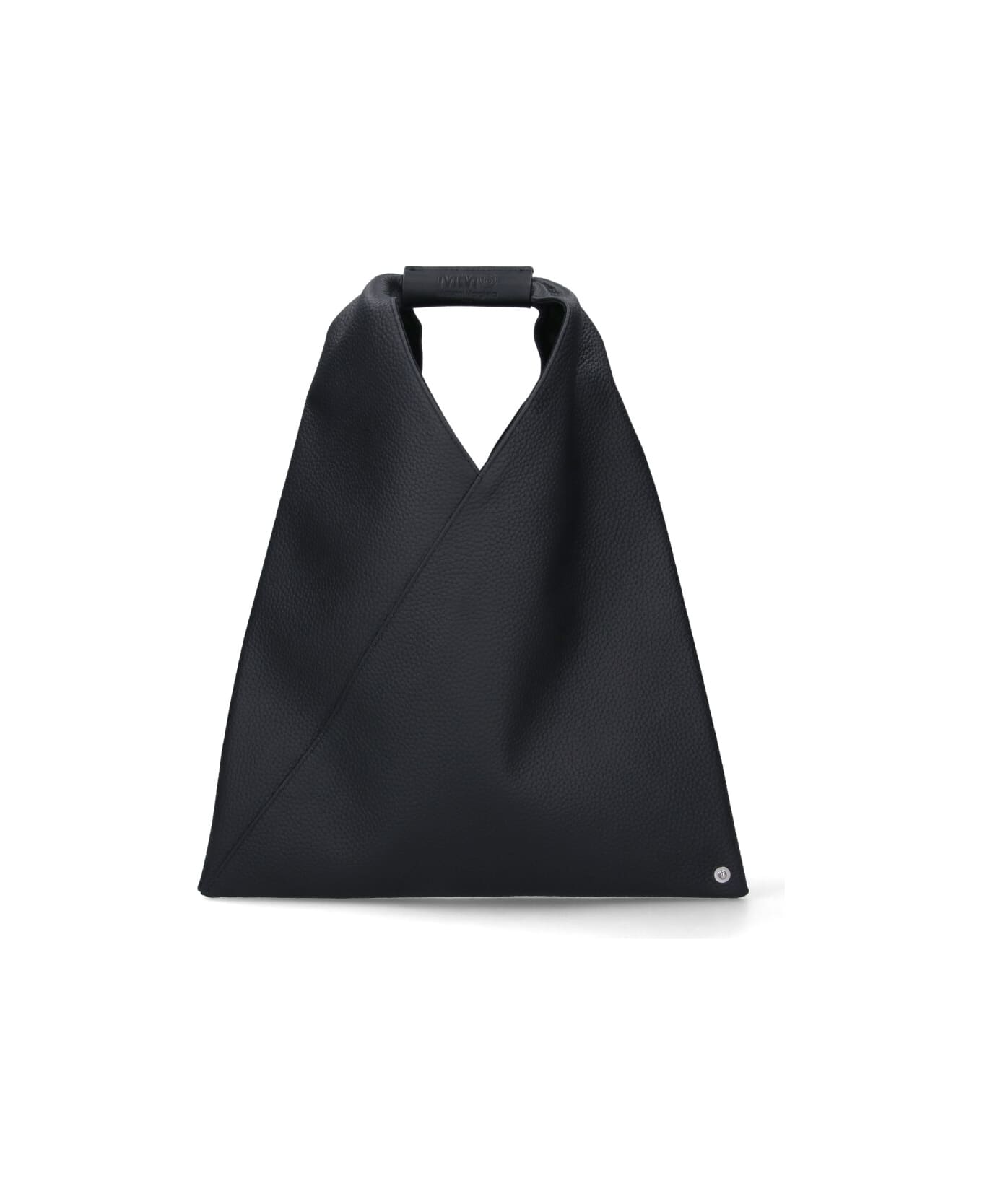 MM6 Maison Margiela 'Japanese' small handbag in black hammered leather with handle, engraved logo detail, button closure, side snap buttons, contrasting logo stitching at the back, single inner compartment.