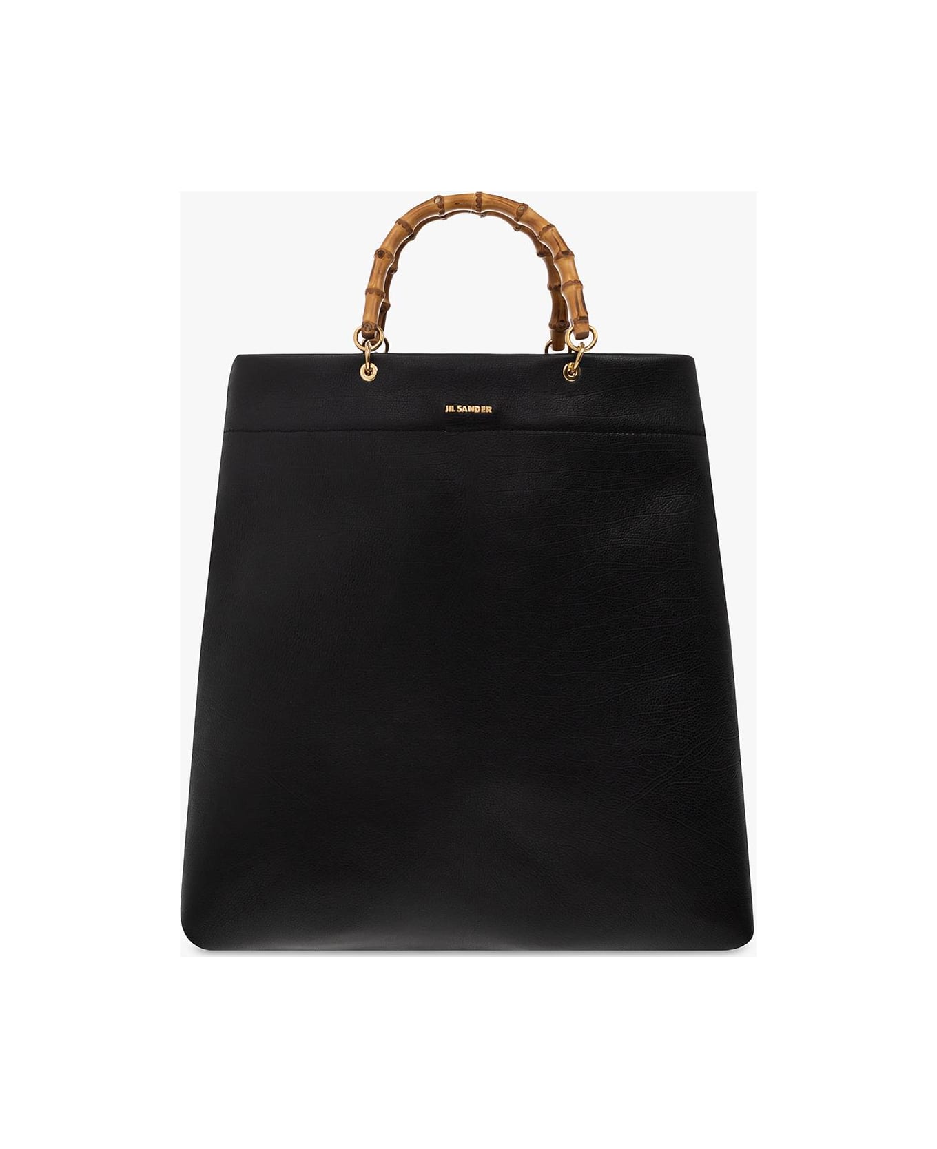 Black shopper bag from Jil Sander. Crafted from lamb leather, this item features a flap closure, metal logo detail, two half-round bamboo handles, detachable and adjustable shoulder strap, gold-tone metal hardware and one internal compartment with one sli