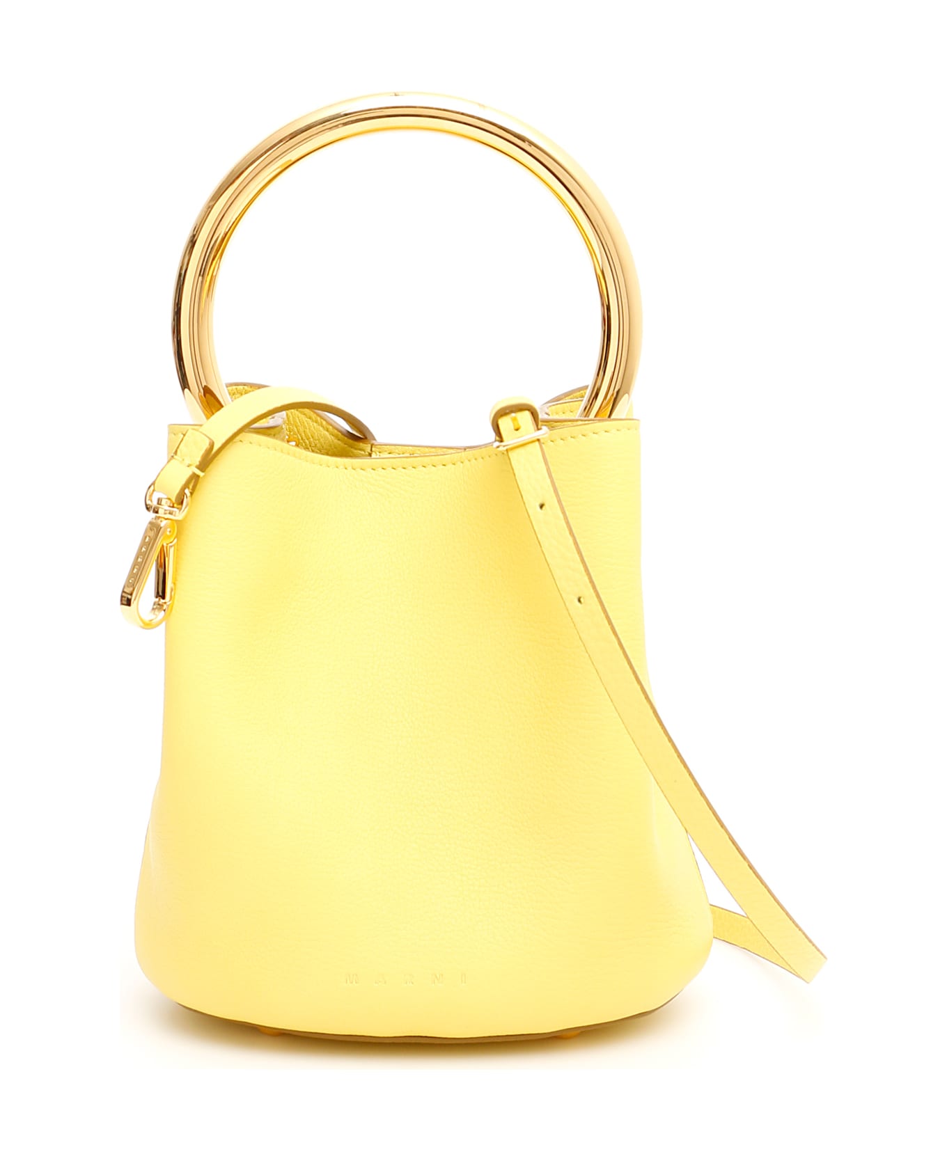 Marni leather Pannier minibag with round plexi and metal handle. Removable and adjustable strap, snap button closure, fabric lining with removable zipped pouch. Contrast hems, base protective studs. Gold-tone metal hardware. Composition: 70% vitello, 25% lana, 5% poliammide