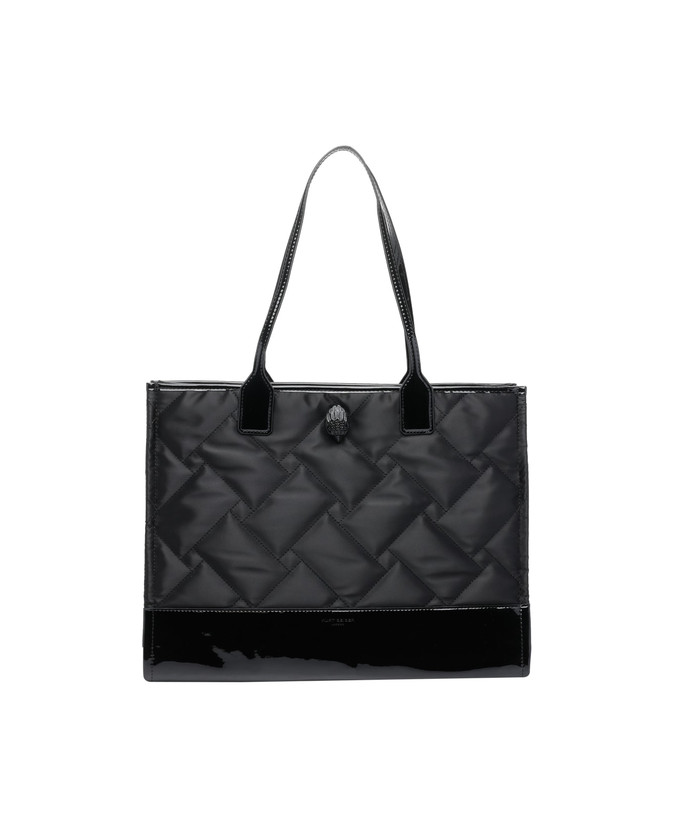 Kurt Geiger black recycled square shopper bag, quilted, zip closure, inner zip pocket, one open pocket and one slot, 2 handles, logo on the front Composition: 100% Recycled Fibres