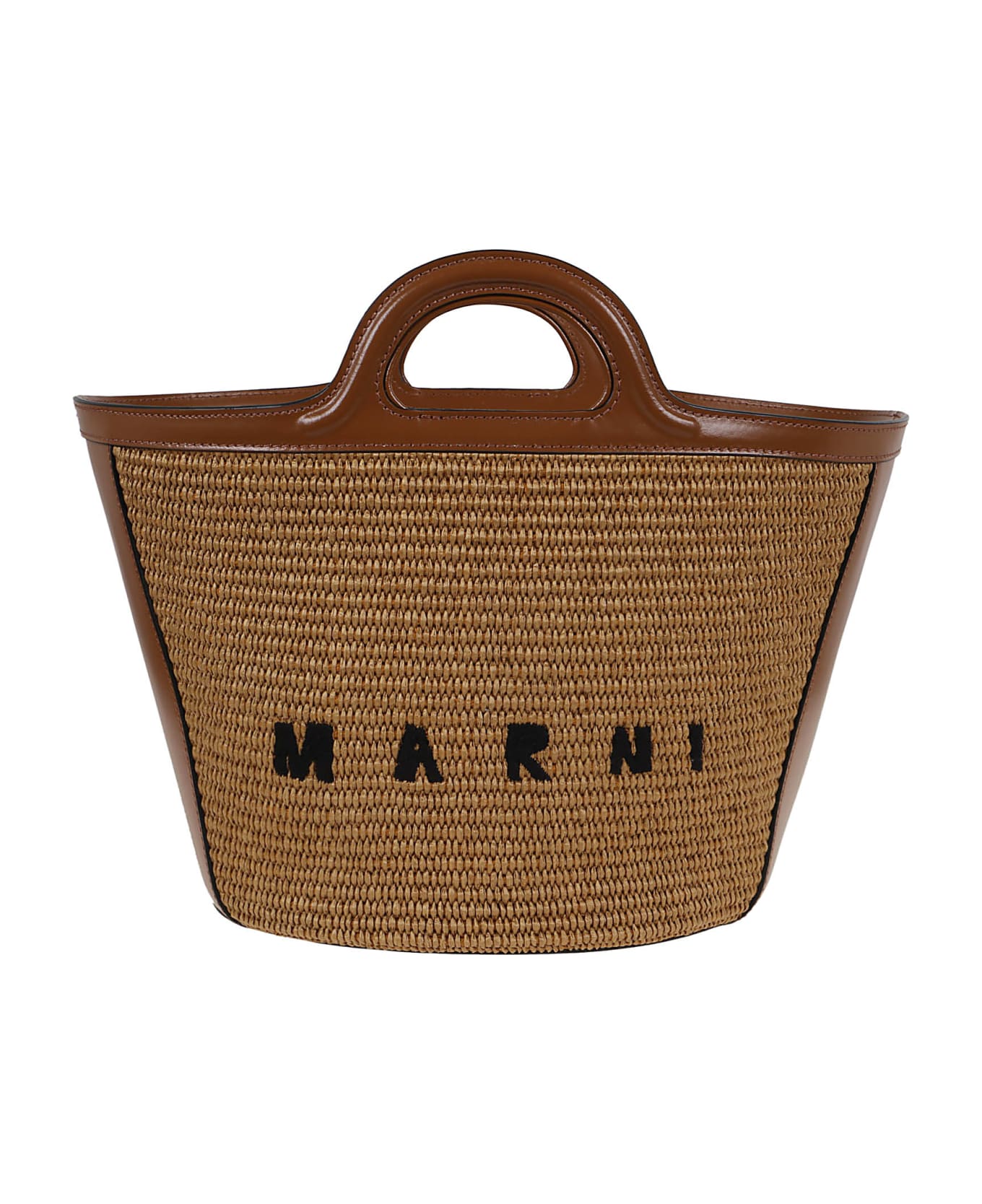 Tropicalia bag small size BY MARNI. Made of leather and with woven raffia panels. Portable by hand and shoulder strap. Handles with embossed details. Leather bottom. Detachable leather shoulder strap. Logo detail embroidered on the front.