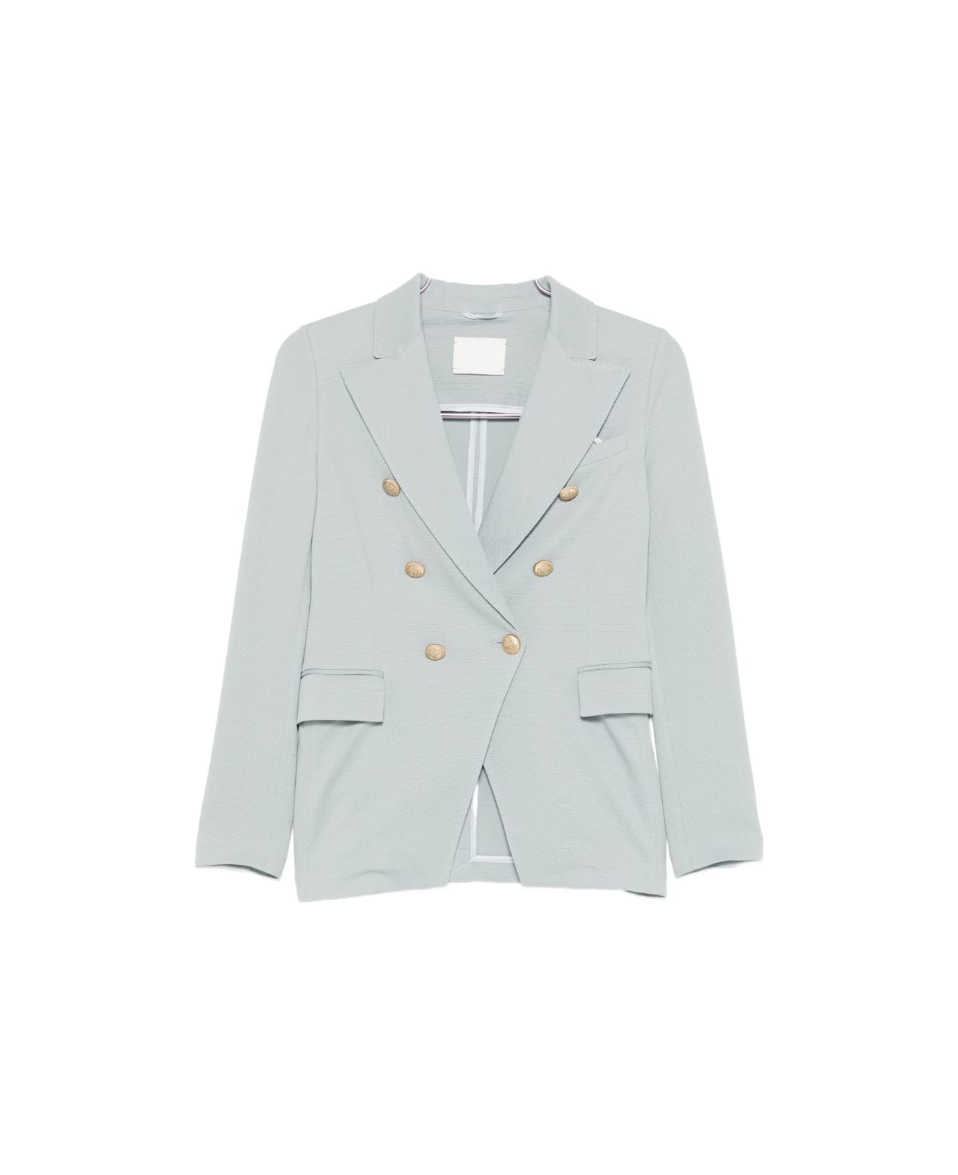 light blue double breasted gold-tone buttons peak lapels front pockets