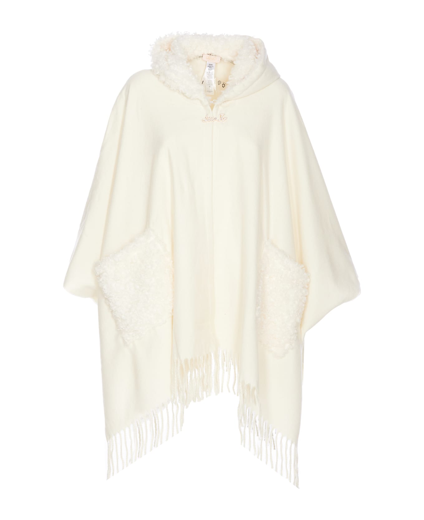 Liu Jo white poncho, hood with inner faux fur shearling detail, satefy pin logo closure on collar, frontal pockets with faux fur shearling detail, fringes at bottom
