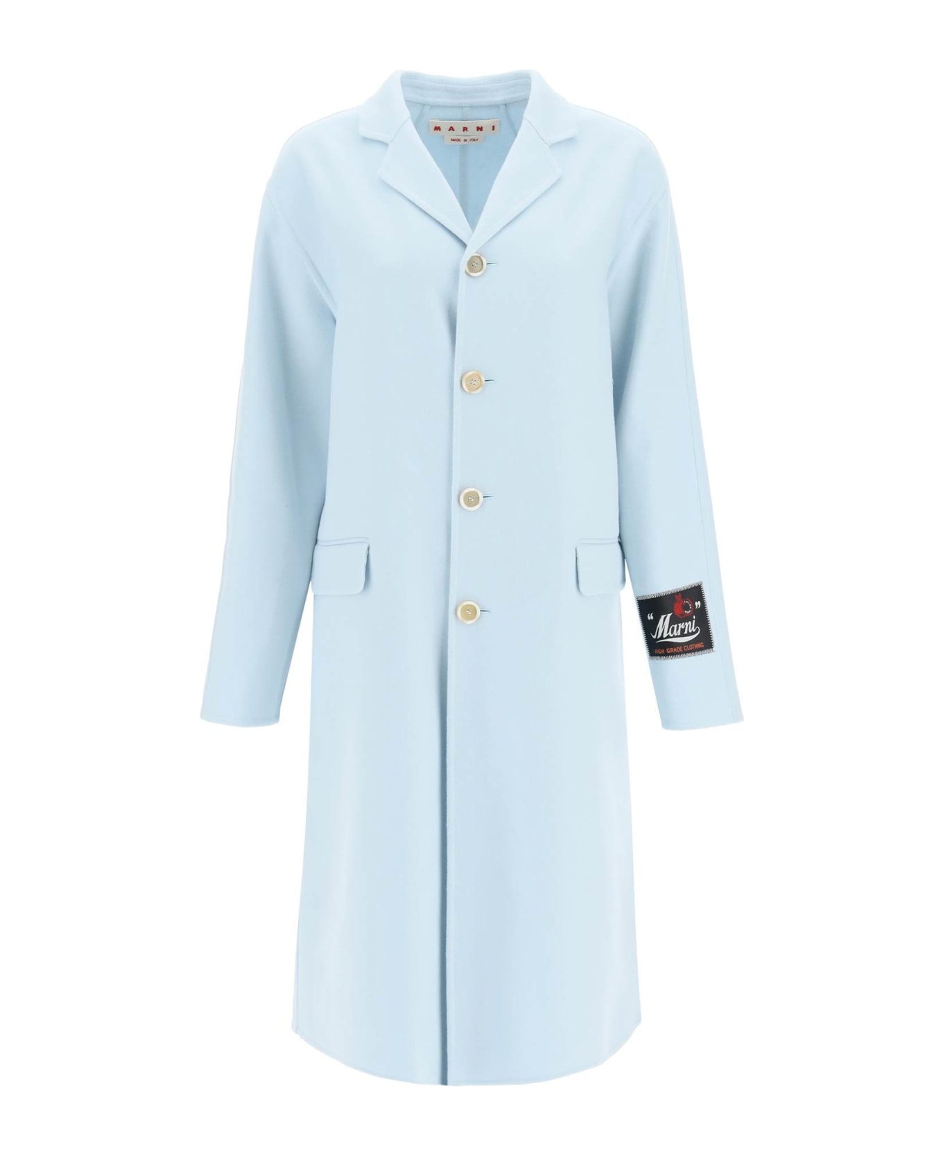 Straight-cut midi coat by Marni, crafted in double virgin wool and cashmere fabric. Single-breasted design with four-button fastening, featuring small notch-lapels and side flap welt pockets. Enriched by a maxi logo label applied on the left cuff. Unlined. The model is 177 cm tall and wears a size IT 40.
