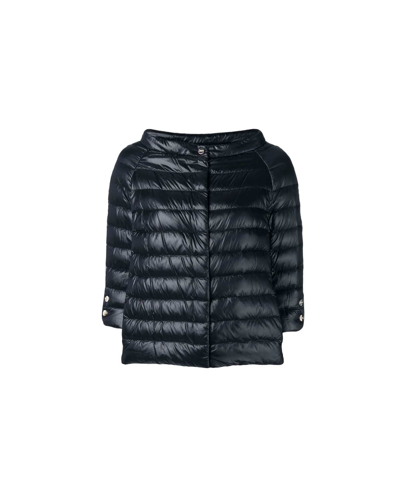 black feather down black front button fastening three-quarter length sleeves buttoned cuffs straight hem