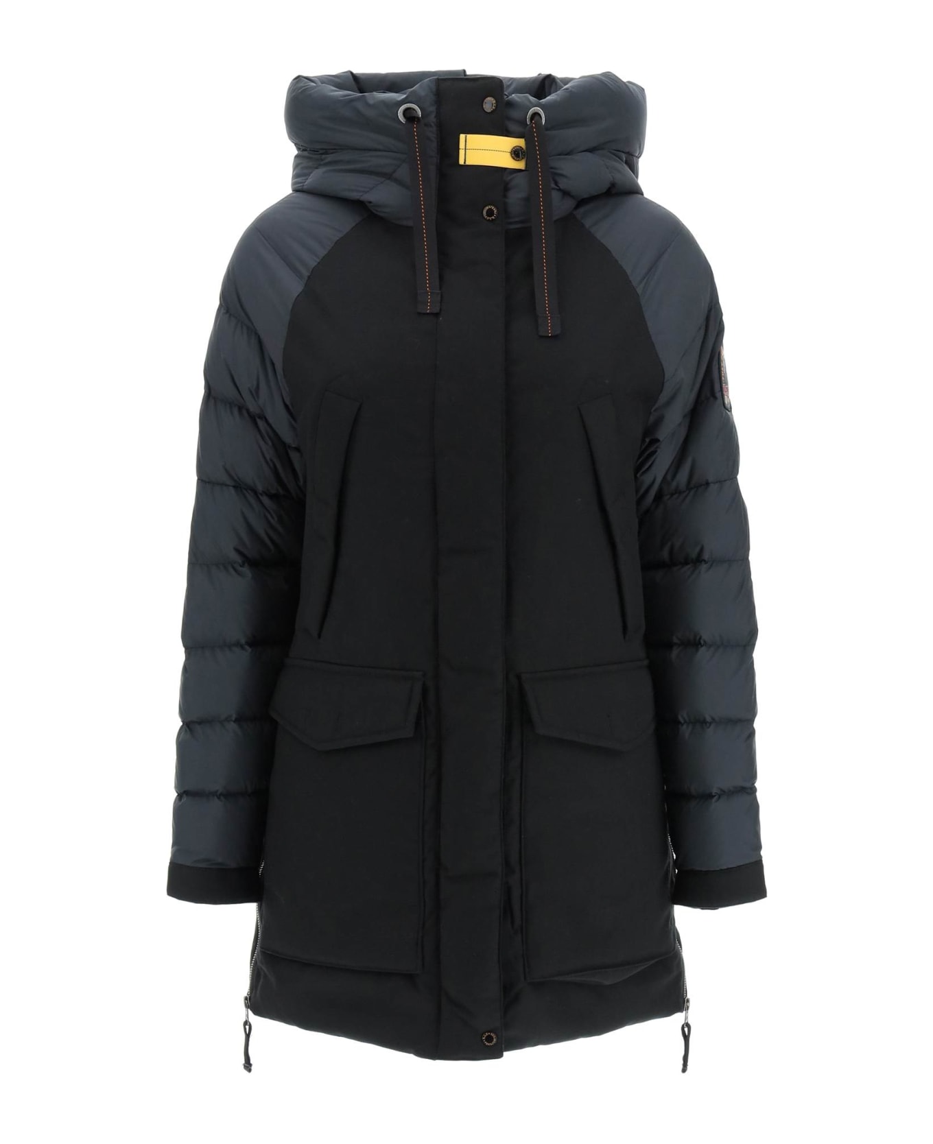 Parajumpers midi jacket in technical twill with quilted nylon taffeta inserts and hood, padded with duck down. Straight-cut style, adjustable with internal drawstring waist, featuring large flap pockets at the bottom and hand warmer pockets at the chest, side zip openings, adjustable cuffs, concealed two-way zip and press stud fastening, and two internal pockets. Detailed with logo patch on the shoulder and signature yellow elastic tab at the neck. The model is 177 cm tall and wears a size S.