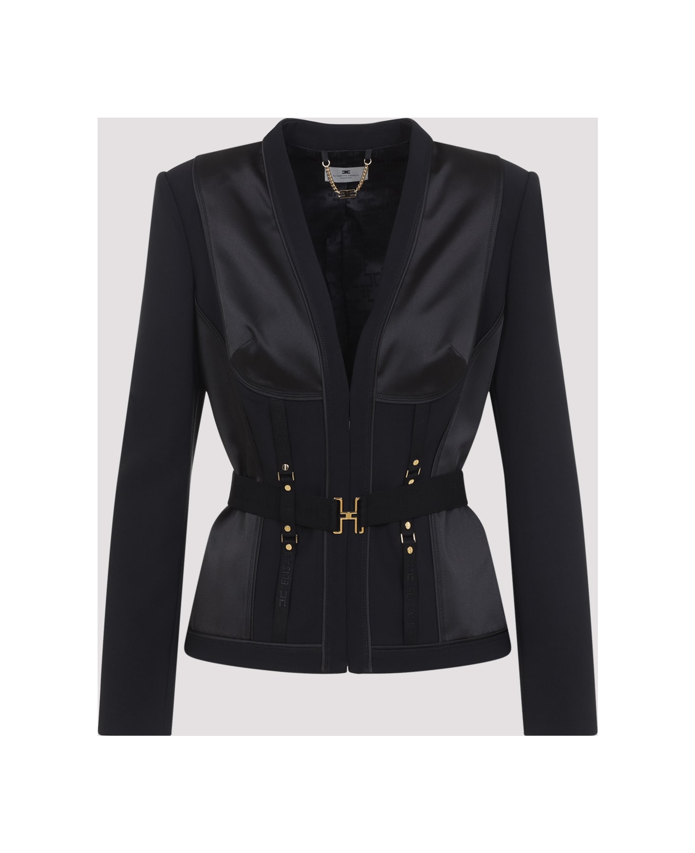 Elisabetta Franchi Bondage Black Polyester Jacket. Crafted from black tech fabric with tonal satin detailing, featuring a V-neckline, a concealed hook fastening, a belt with a gold-toned buckle, branded straps on the front and back, long sleeves, and a full lining.