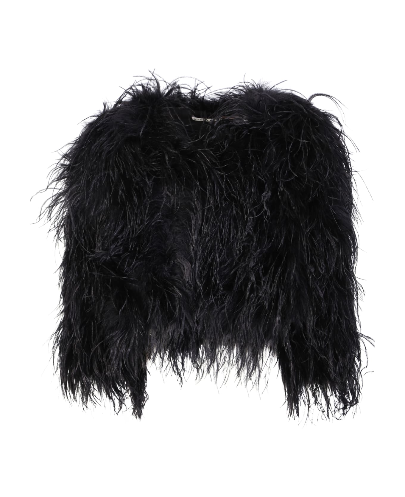 Roundneck. Long sleeves. Concealed front fastening. Feathered design. Color: black