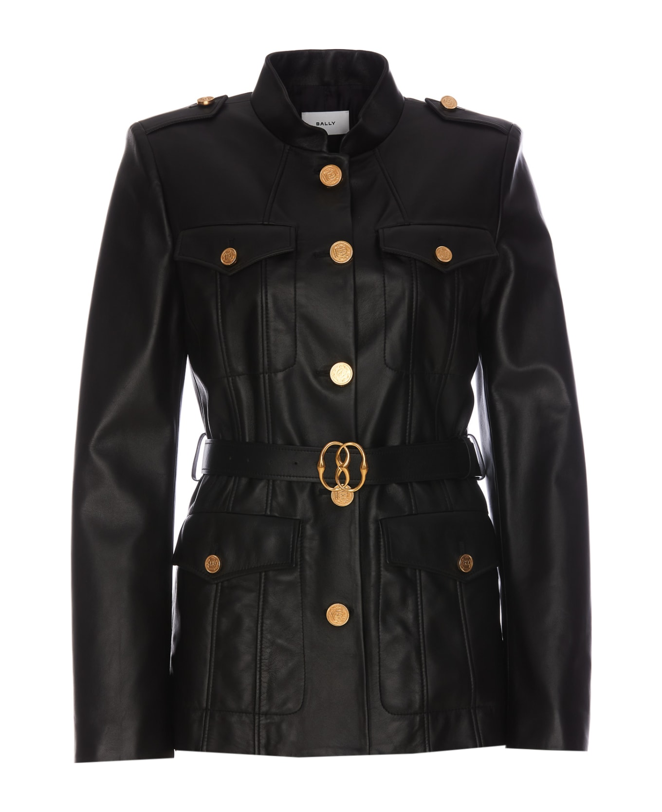 Bally black leather jacket with frontal golden logo buttons closure, frontal pockets, belt detail with golden detail, tabs on shoulder, splt detail on the back
