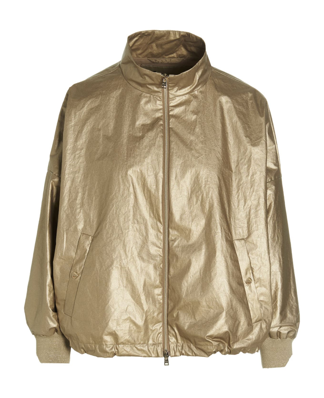 Leisure' laminated cotton bomber jacket with nylon lining, zip closure, a high collar, long knitted cuffed sleeves, pockets and a drawstring adjustable on the leg bottom. Composition: 100% cotton