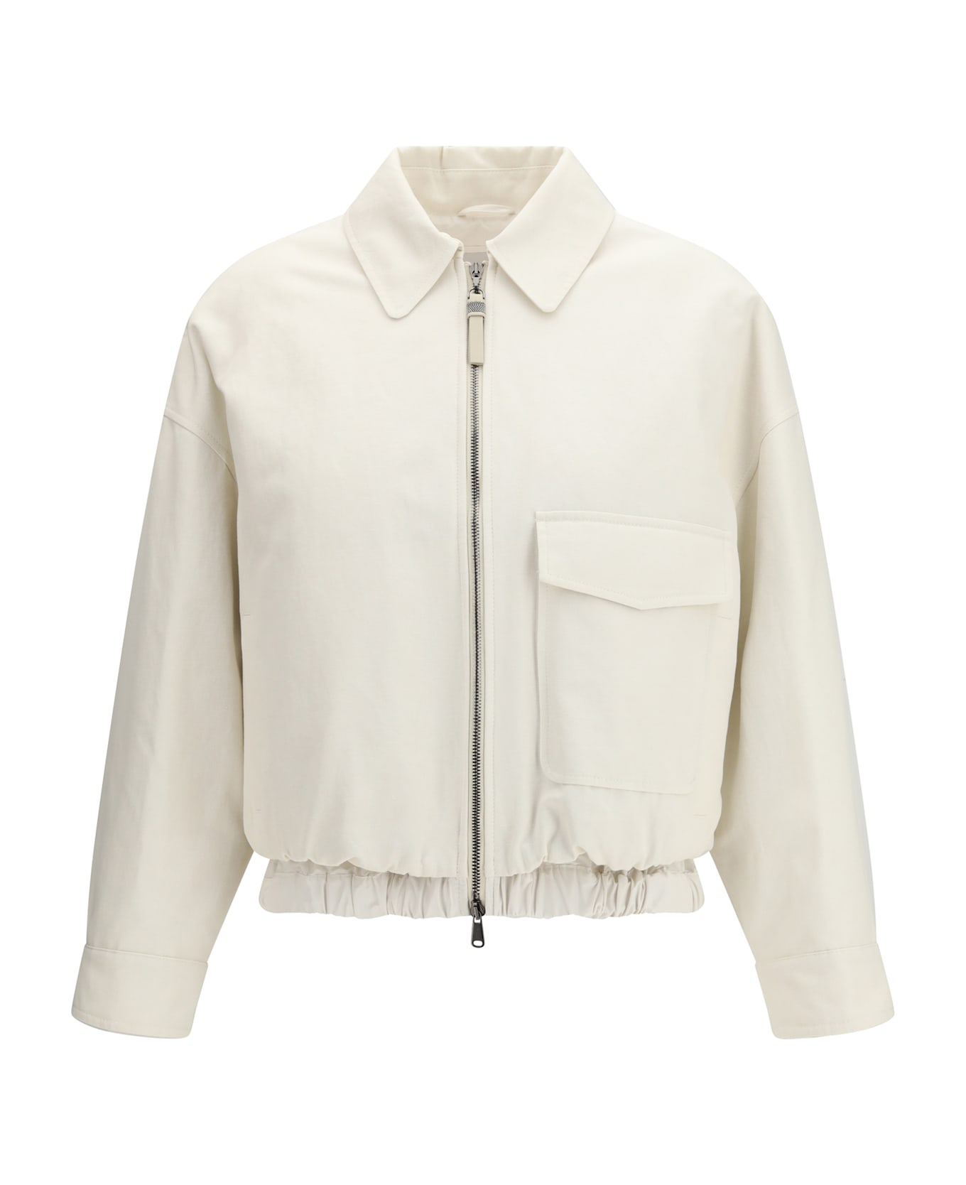 The linen jacket by brunello cucinelli expresses a contemporary aesthetic enriched with refined details. crafted from linen, it features a two-way zip fastening, two side pockets and a flap patch pocket that enhance its functionality. the layered effect adds depth to the design, while the leather zip pull with eco-brass monili chain introduces a subtle luminous accent, reflecting the brand s signature understated elegance.